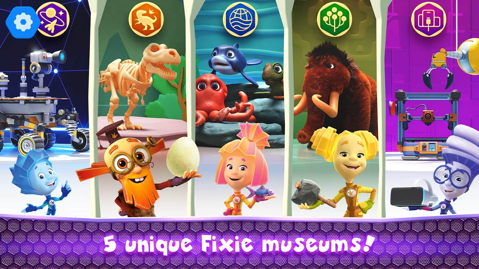 Фиксики: Космическая История - Откройте для себя захватывающий мир «Фиксиков» на Android. Здесь тебя ждут твои любимые герои Нолик, Симка, Шпуля и другие. В этой детской игре ты отправишься в пять виртуальных музеев с удивительной историей и увлекательными квестами. Тебя ждут захватывающие приключения в космосе, мире гаджетов, времена динозавров, подводном мире и музее естественных наук. Играй вместе с Фиксиками и стань исследователем мира: от далеких глубин океана до звездных просторов космоса. Начни играть прямо сейчас и окунись в мир знаний и удивительных открытий вместе с Фиксиками.