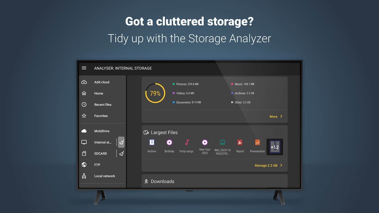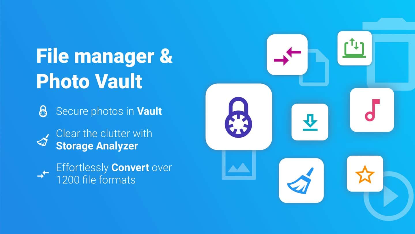 File Commander - File Manager - Удобный файловый менеджер, который по праву называется одним из лучших. Прямым доказательством качества этого приложения, является то, что его скачали миллионы людей! Множество положительных отзывов и оценок. И не зря, оно весьма простое, многофункциональное и удобное. Зайдя в меню вам сразу предложат категории, в которых будут все ваши файлы, так же, вы сможете посмотреть какие файлы сейчас качаются, сколько памяти осталось на вашем смартфоне, и даже какие файлы были запущены последними. Так же, при помощи этого приложения, можно подключатся к FTP серверам, и обмениваться данными с вашим PC.