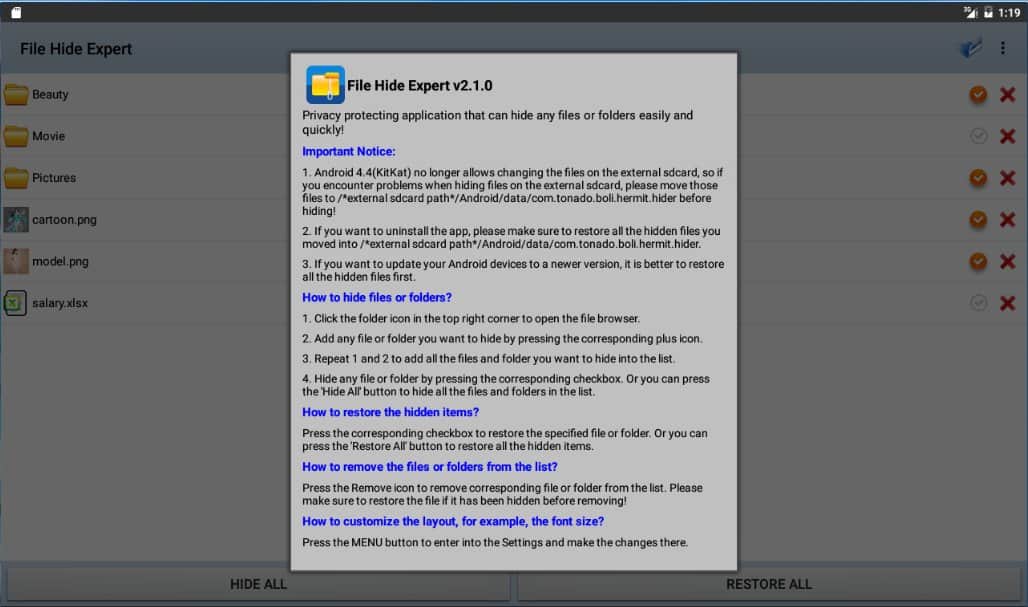 File Hide Pro – отличное приложение для андроид от разработчиков Emily Smith, позволяющее скрывать нужную вам информацию, находящуюся в файлах и папках, от любопытных глаз.