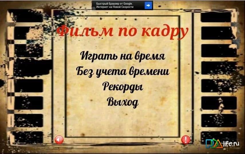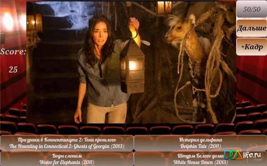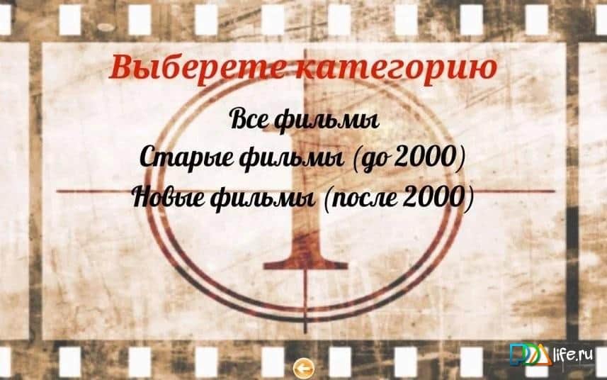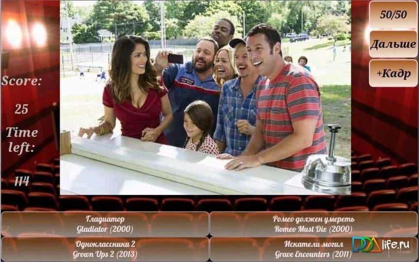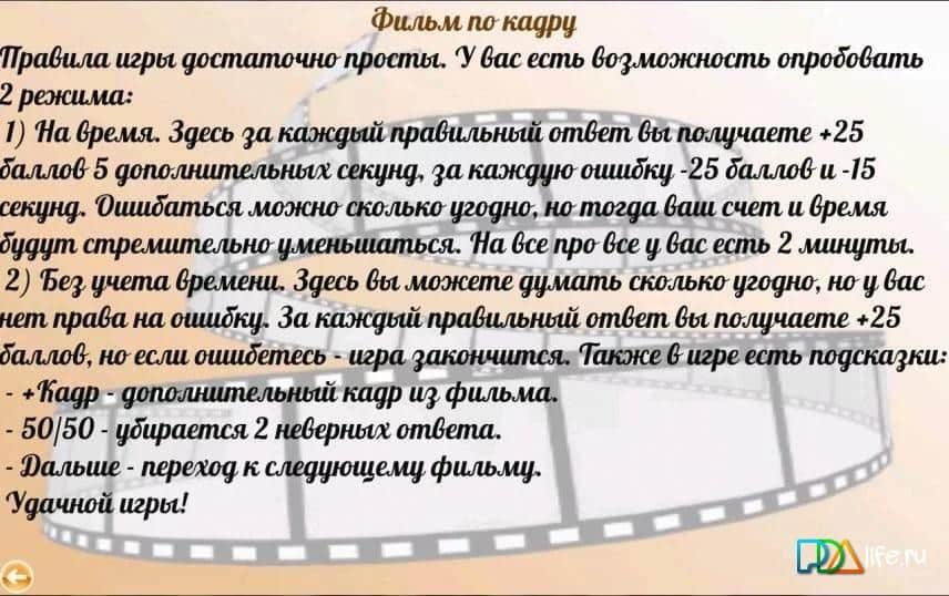 Фильм по кадру - Если вы любите смотреть фильмы, то эта андроид викторина именно для вас. В игре доступно несколько категорий, фильмы до 2000 года, и после. Ваша задача угадать по появившемуся кадру название фильма. На это вам дается четыре варианта ответа. Так же есть возможность подсказки 50/50, которая убирает половину неправильных вариантов ответа, так же можно пропустить кадр, или попросит дополнительный кадр к фильму.