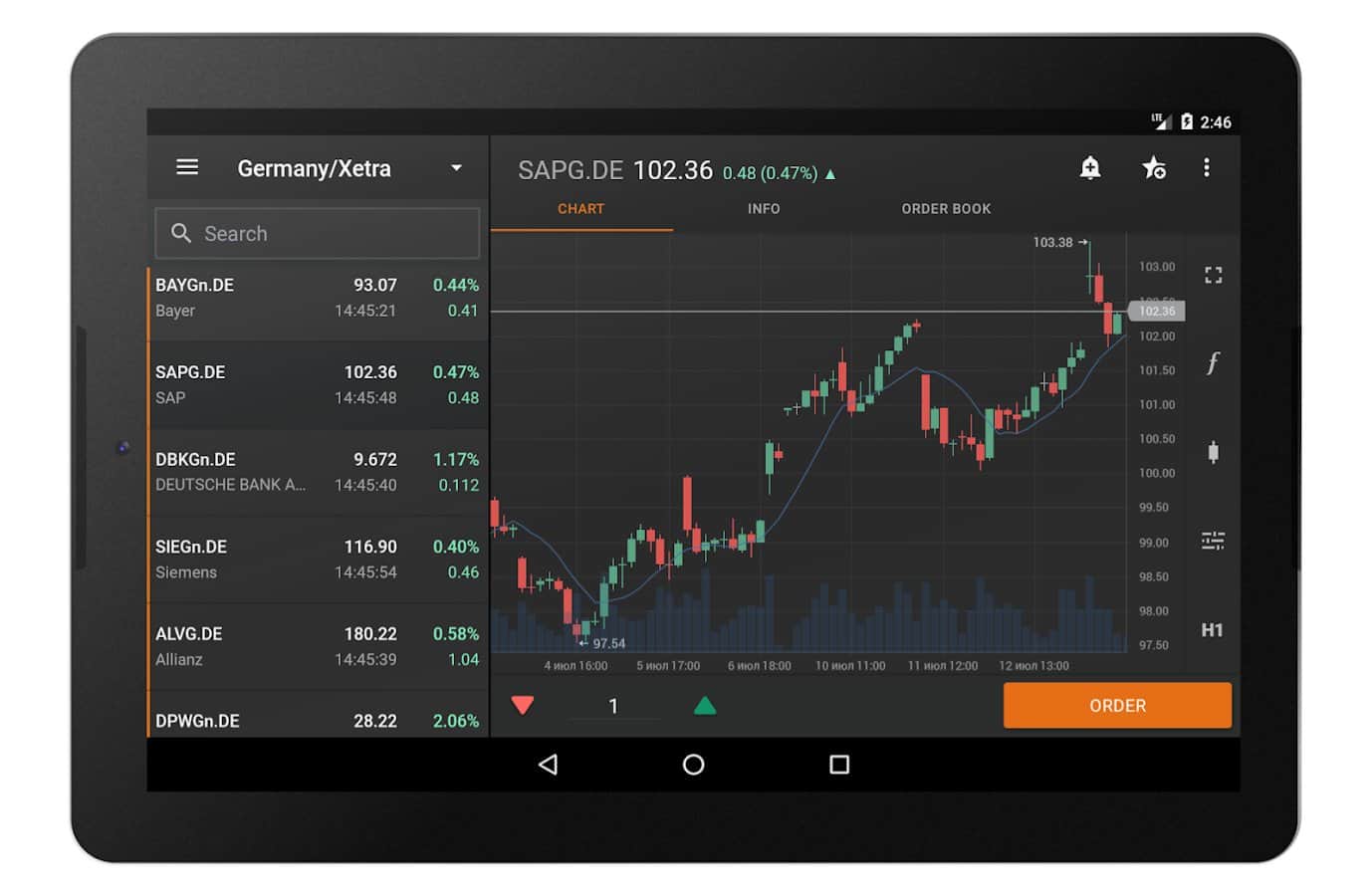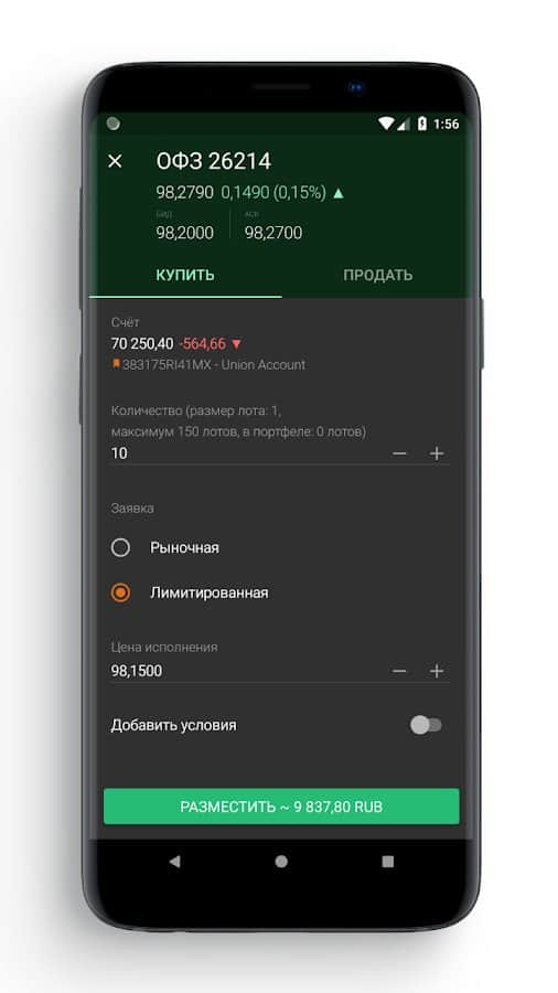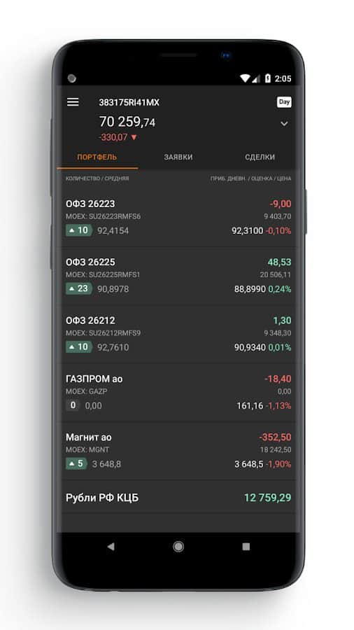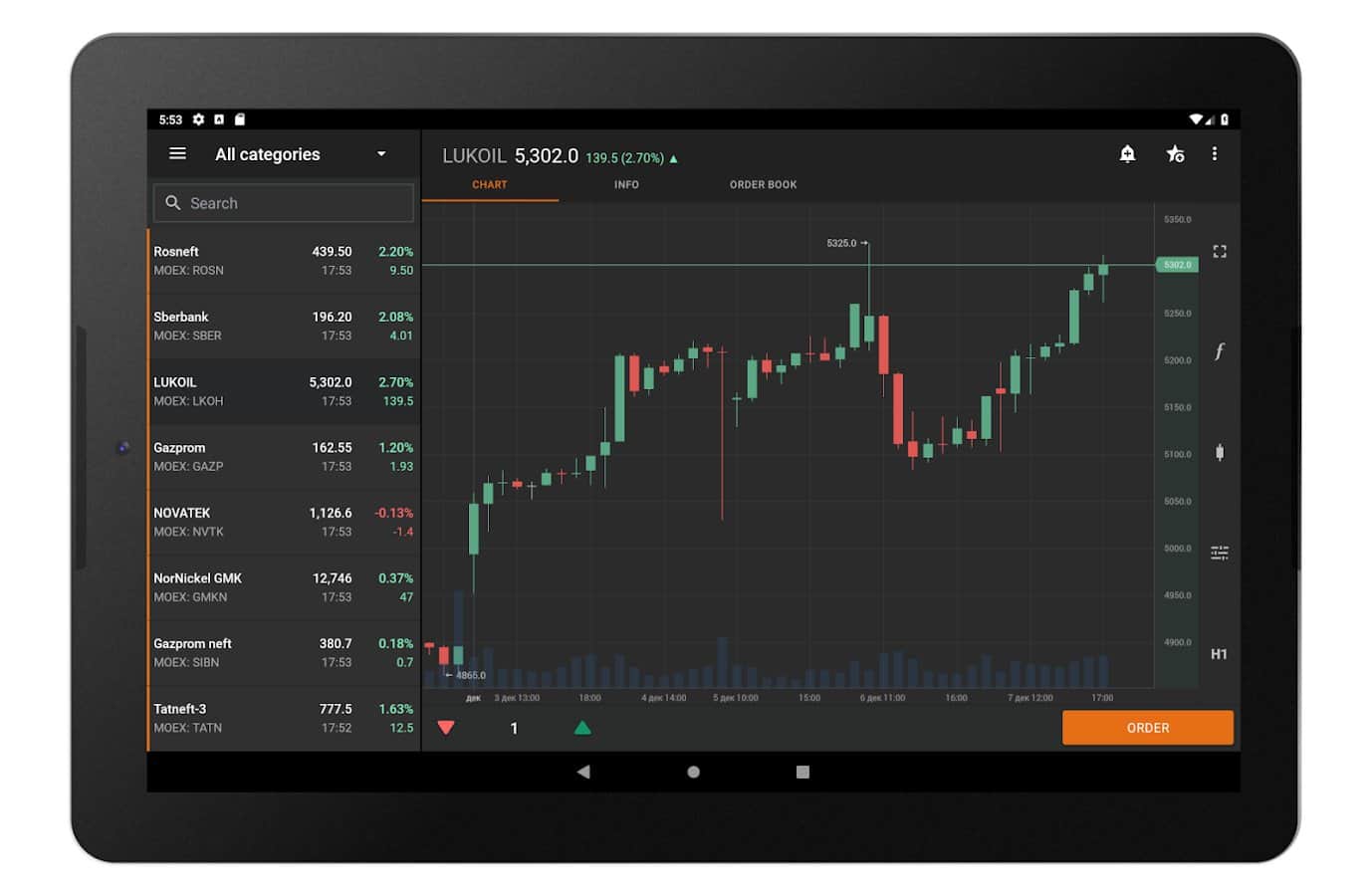 отслеживать курсы акций, вьючерсов, облигаций, валют, опционов. Интуитивно понятный дизайн программы пломожет вам наглядно следить за котировками и графиками, совершать выгодные торговые сделки, следить за актуальными финансовыми новостями, чтобы ничего не упустить из виду. Отсутствие задержки, контроль за состоянием счетов, наличие пуш-уведомлений на устройство о ходе торгов, операции с активами, ведение календаря статистики рынка - все это явные преимущества для современных трейдеров.