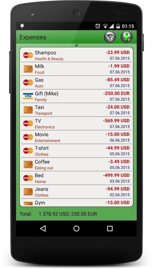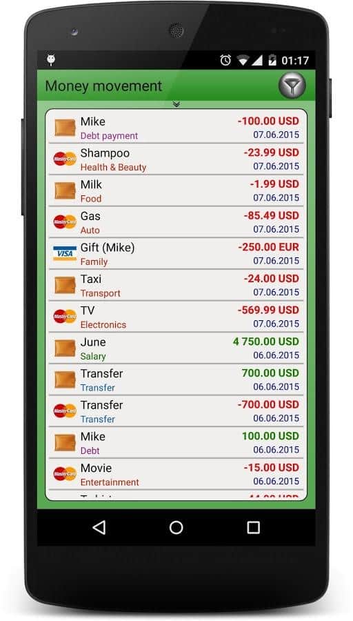 Finance Manager - Следите за своими финансами, и контролируйте их с помощью этого простого приложения. Удобный интерфейс и деление на категории помогут вам ориентироваться в ваших финансах, вам даже будет показано как вы расплачивались, картой или же наличкой. Точные подробности каждой финансовой операции, а так же автоматический подсчет и планировка растрат и прибыли на будущее упростят управление финансами в целом.