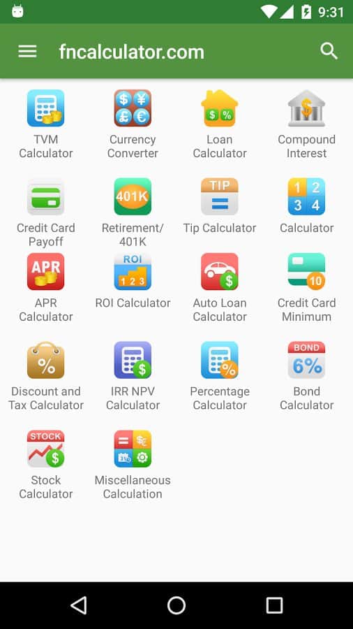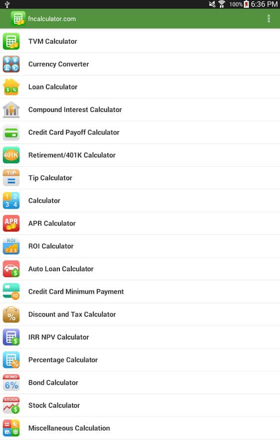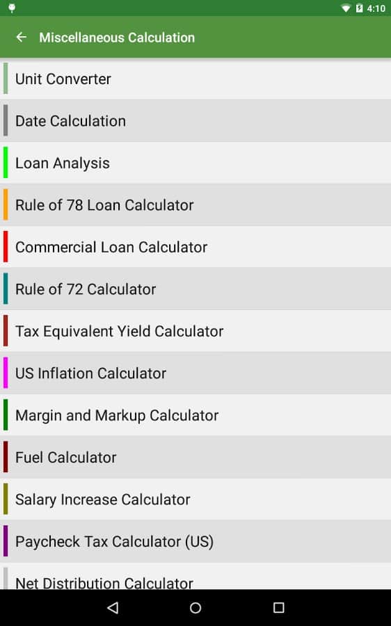 Financial Calculators - Это приложение, соединило в себе всевозможные финансовые калькуляторы. Здесь собрано все самое лучшее, и всё это предоставлено одним простым приложением, с понятным и приятным интерфейсом, и множеством дополнительных функций. Зайдя в приложение, вы наткнетесь на список калькуляторов, просто выберите то что вам нужно, и считайте. Больше не нужно хранить у себя на устройстве десяток различных калькуляторов.