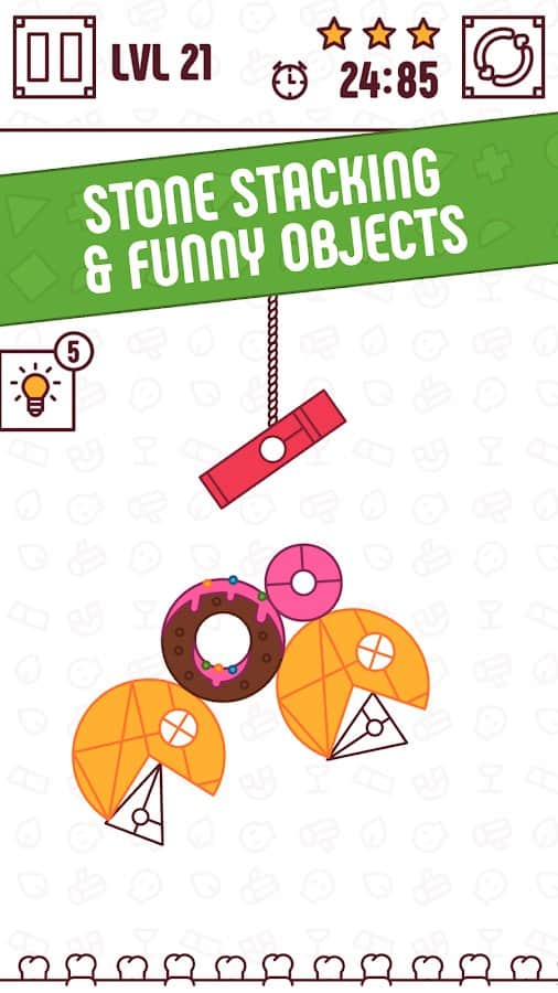 Find The Balance - Physical Funny Objects Puzzle – захватывающая головоломка на андроид, где вы будете сооружать башню из различных объектов. Разнообразные объекты будут привязаны к веревке и спускаться вниз, вашей задачей будет устанавливать их так, обрезая веревку чтобы они сооружали башню и держали равновесие. Укладывайте объекты в разной последовательности и держите баланс, не роняя их бесконтрольно. Тренируйте свою отличную реакцию и сообразительность пройдите 100 уровней игры. В игре представлено 4 режима такие как: классический, звезды, бесконечное и рождество. Разблокируйте для себя все 10 режущих предметов и наслаждайтесь реалистичной физикой.