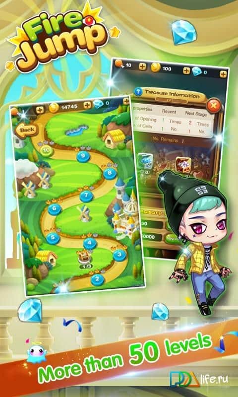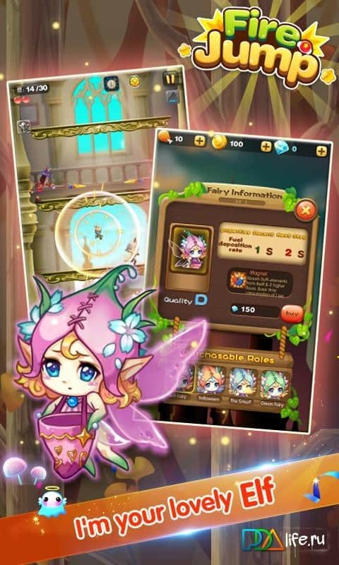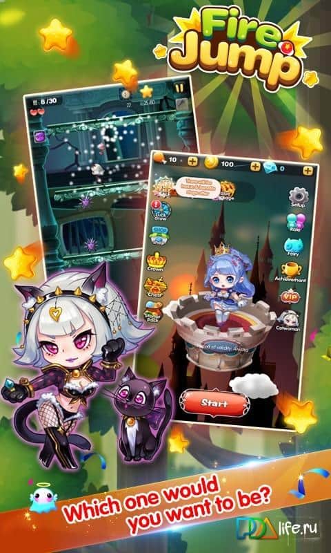 Fire Jump - аркадный джампер с казуальным управлением и сказочным сюжетом. События игры разворачиваются вокруг принцессы и конечно же принца, ваша задача помочь встретиться влюбленной паре. Для этого вам необходимо управляя персонажем перепрыгивать с платформы на платформу, при этом собирая звездочки, призы и стараясь избежать столкновения с врагами. Визуально игры выполнена в милом красочном стиле, котята, забавные эльфы, прочие персонажи. Красочная графика, прекрасно передающая общую атмосферу игры в сочетании с простым управлением позволит каждому поклоннику данного жанра приятно провести время.