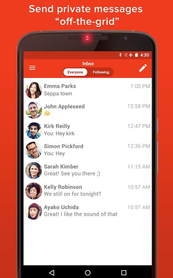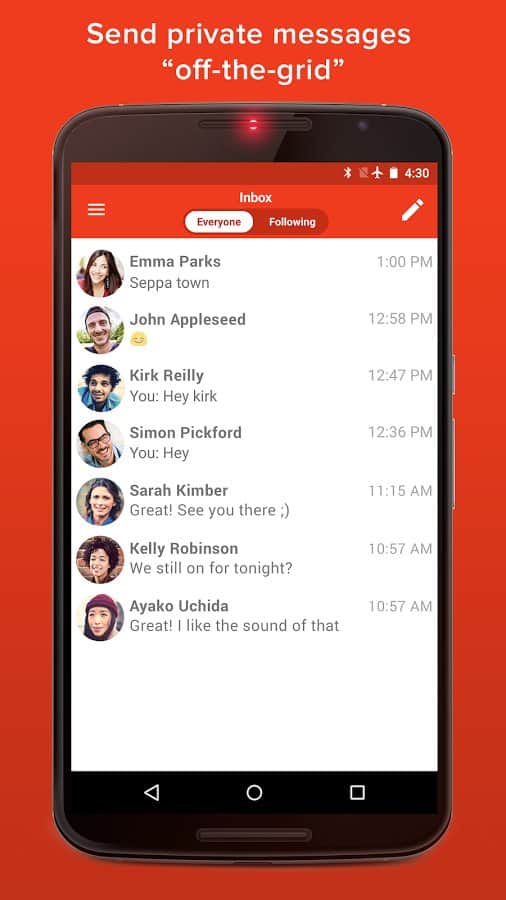 Итак, чем больше рядом с вами пользователей этого приложения, тем быстрее и стабильнее будет связь. Доступны приватные чаты, общение с людьми поблизости и так называемый глобальный чат, причем последнему все же нужно интернет-подключение. Интерфейс приложение простой, настроек — минимум, так что разобраться совсем несложно.