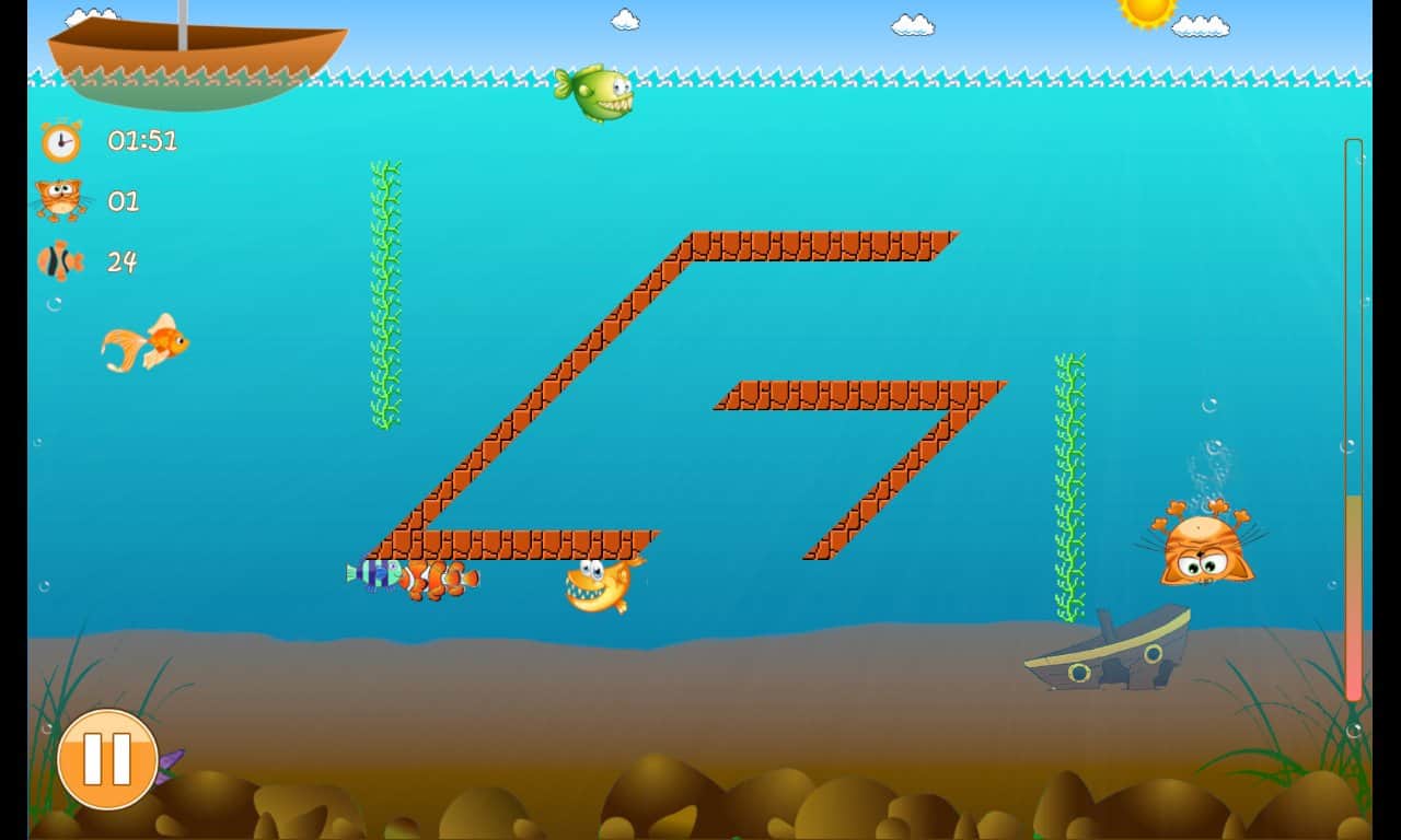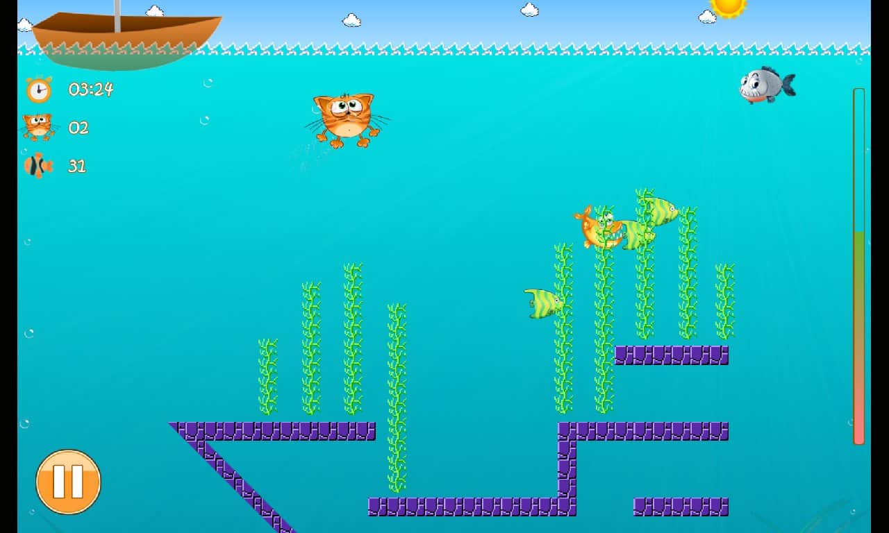 Fisher Cat – веселая игра на андроид, где вы будете управлять котом, который ловит рыбу. Возьмите под свой контроль кота и проведите его по многочисленным и разнообразным уровням игры собирая как можно больше рыбы. Перемещайтесь по четырем локациям и остерегайтесь встречи с хищными рыбами. Набирайте достаточное количество очков и не забывайте вовремя всплывать на поверхность ведь запас кислорода у вас будет ограничен.