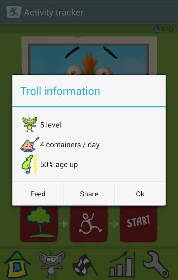 FitnessTroll - Walk Run Game - отличная игра совмещённая со спортивным трекером. В вашем телефоне обзавёлся троль, который поможет вам заниматься физическими упражнениями и тренировками. Всё это буде происходить в интересной и новой для вас атмосфере. Тролль всегда хочет есть, а для того чтобы наполнить его желудок до полна необходимо хорошенько попотеть и выполнить несколько физических упражнений. Хорошо его кормите и он будет расти, но вслед за этим растёт и его аппетит. Но вы уже знаете как с ним бороться) Так что собираемся с силами и вперёд к здоровому образу жизни. Удачных тренировок!