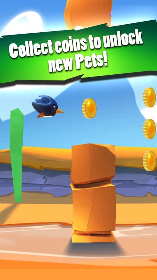 Flappy Pets 3D - Увлекательная аркада на андроид, в которой вы будете играть приятными зверушками. Ваша задача пройти уровень среди расставленных колон. Но это будет не просто. Если ваш питомец врежется или упадет –вы проиграете. Поддерживайте его в воздухе, тапая вовремя по экрану. При этом всем, еще не забудьте собирать монеты на уровне. За собранные средства вы можете приобрести новых героев.
