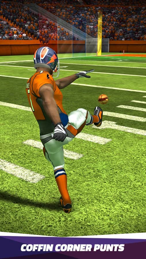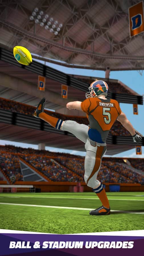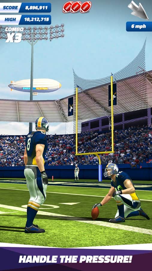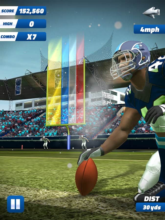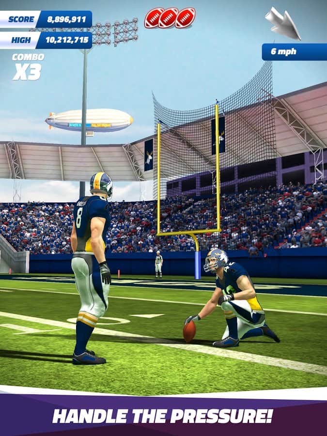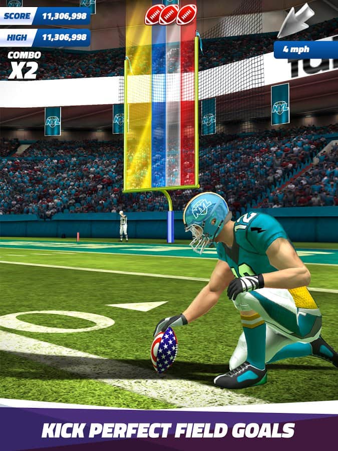 Flick Field Goal 16 – играйте в американский футбол и станьте его легендой. Выходите на игровое поле и выполняйте различные задачи и миссии, нанося точные удары по мячу и забивая голы в ворота. Бейте как можно сильнее ногой по мячу и отправляйте мяч лететь точно в цель отмеченные на поле специальным светом. Улучшайте способности своего футболиста, тренируя его, а также набирайте очки, чтобы подняться как можно выше в таблице лидеров. За отлично пройденный сезон получайте награды в виде нового снаряжения и формы для игрока. Игра порадует вас отличной физикой, несколькими режимами игры и различными погодными условиями.