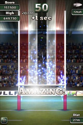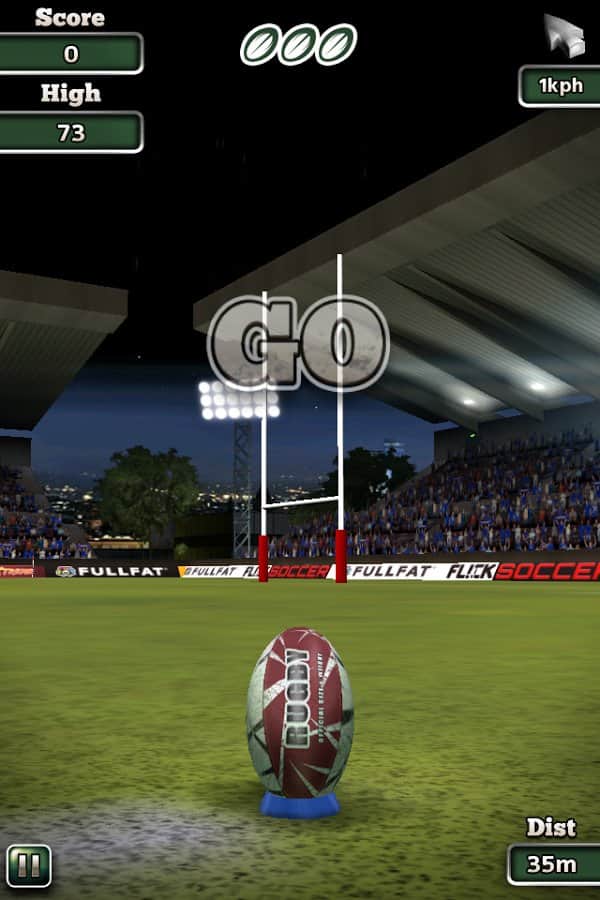 Flick Nations Rugby - самый реалистичный симулятор игры американский футбол для андроид предлагает сделать решающий бросок по воротам! Прежде всего - тренировки. Не игнорируйте их, будь вы асом игры в реальной жизни или же любителем, а особенно, если вы никогда не играли в американский футбол! Когда набьете руку, а точнее палец - тогда уж можно выбрать и одну из 15 стран, флаг и честь которой вы хотите представлять: Англия, Италия, Уэльс, Франция, Австралия и др. Каждыый новый уровень игры преподносит свои сюрпризы - в одном надо набрать максимальное количество игровых очков, отправляя мяч в указанные зоны, отмеченные разными цветами, в другом - выбивать все имеющиеся зоны, и т.д. Ваша основная задача - попасть в ворота с максимальной точностью. В воротах, как вы уже поняли, имеется пять зон, каждая из которых приносит конкретное количество очков. Центральная зона самая очковая! Сложность игры начинает увеличиваться, когда появляются боковые порывы ветра и траекторию полета мяча приходиться корректировать при помощи кручения в воздухе. Игра имеет великолепную графику с высоким разрешением!