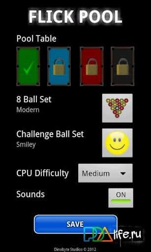 Не всегда получается поиграть в бильярд, когда хочется - нет возможности, времени, друзей и пр...Теперь все изменится Flick Pool, стоит только скачать бильярд на Андроид. Тут вы можете играть сами, или с друзьями на одном устройстве или по сети, или померяйтесь силами с компьютером! Удобное управление, хорошая графика. Мяч весьма реалистичен, физика хороша, вообщем удовольствие гарантировано! Играйте в 8-9 шаров, одиночку или непрерывную игру. Есть возможность переключения режимов удара и прицеливания!