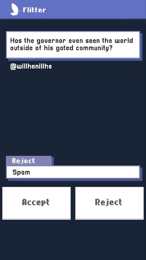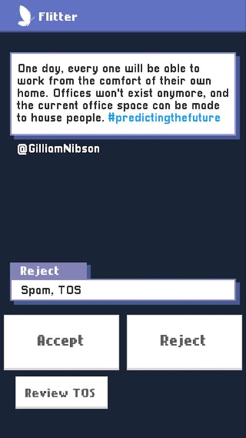Flitter Inc. – приключенческая игра на андроид, где вы перенесетесь в 1982 год где будете раскрывать для себя правду организации Flitter. В этой игре вы станете сотрудником компании, которая изучает новые технологии на нашей планете. Ваша работа будет заключатся в том, чтобы следить за тем что платформа микро-сообщений остается дружелюбной, уважительной и спамом. Вы будете выступать словно винтик в машине чьи интересы намного выше ваших. Исследуйте странный мир, выраженный через голоса и сообщения и следите за всеми голосами. Раскройте все тайны игры, которая будет имитировать работу в офисе.