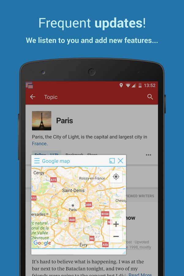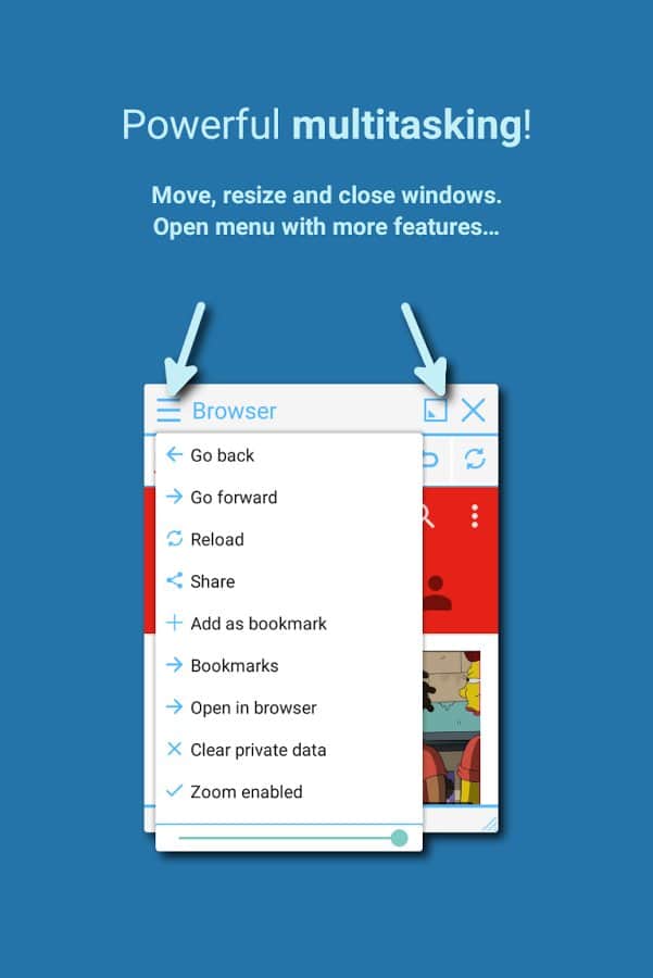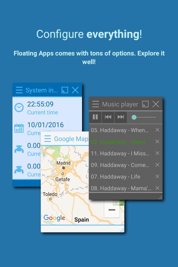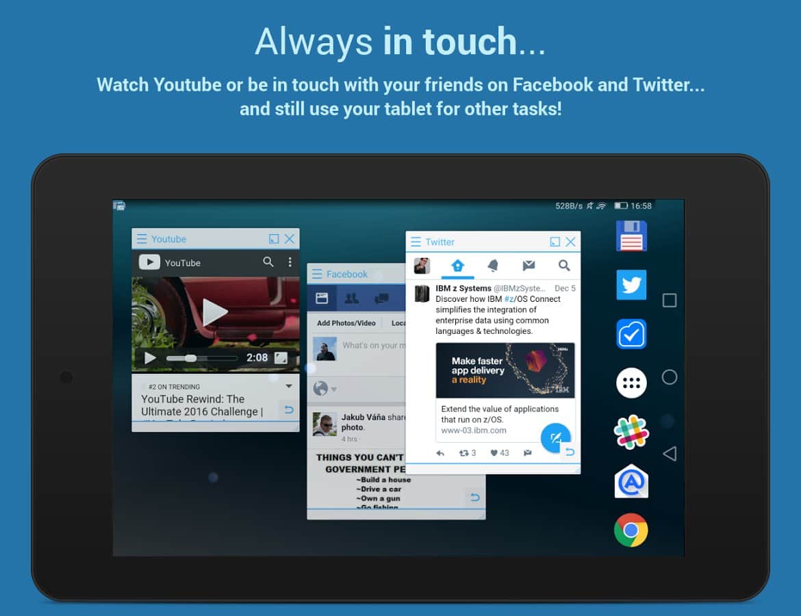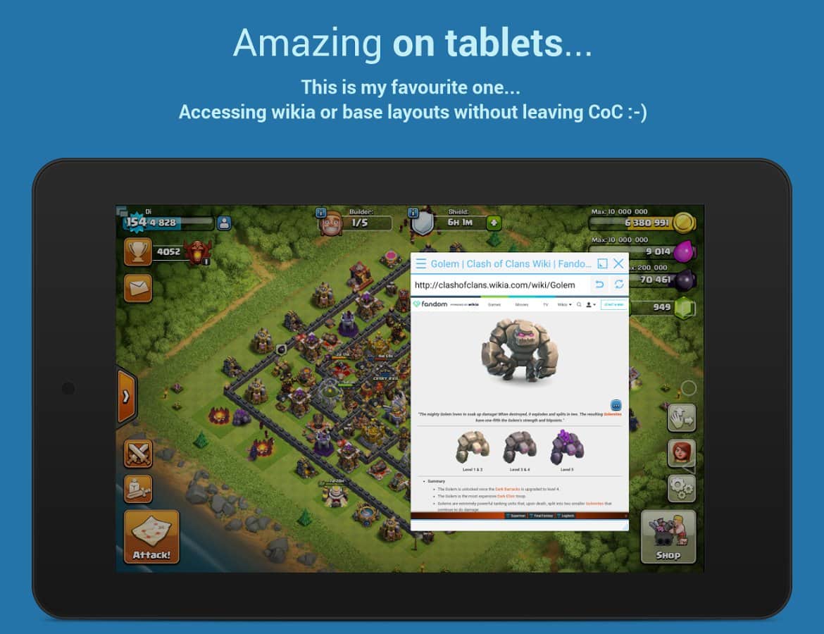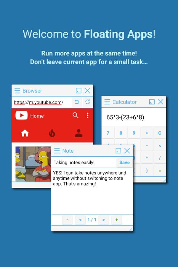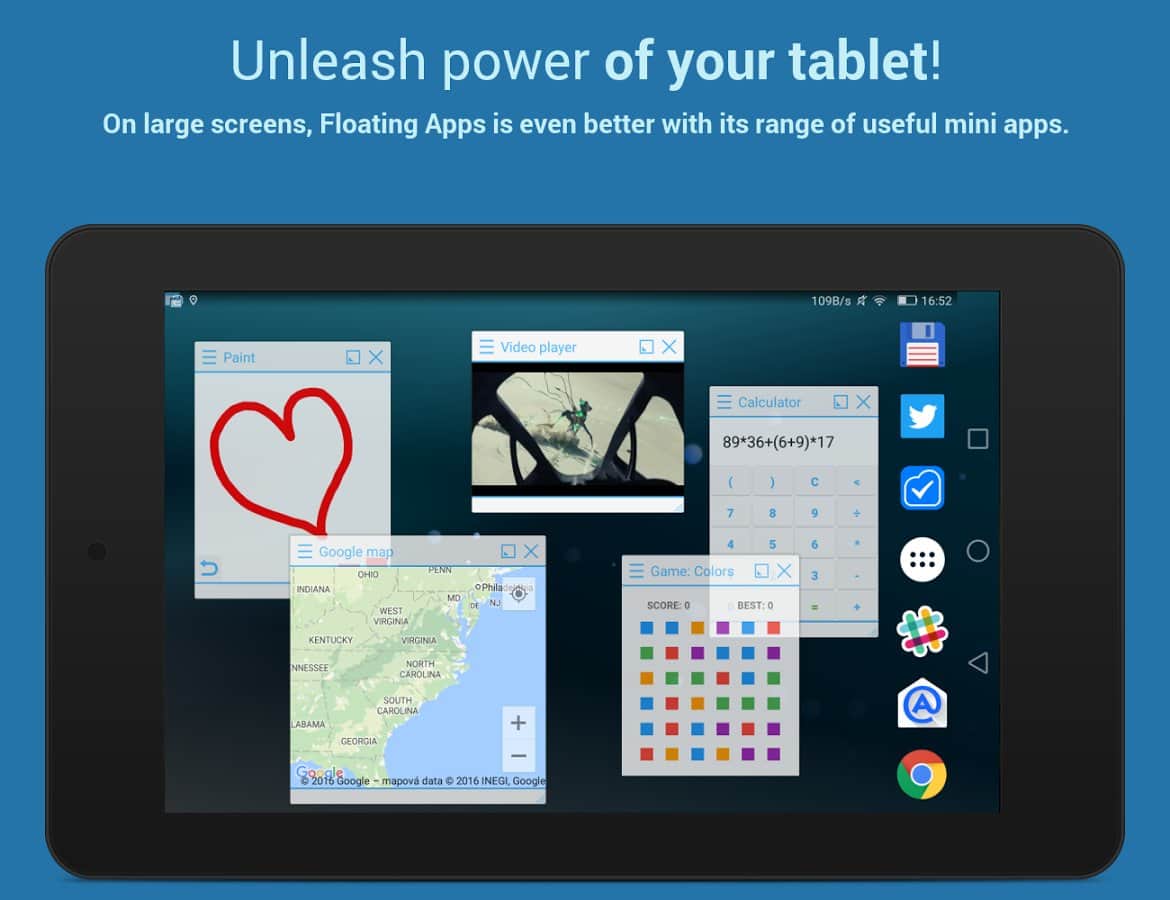 Floating Apps (multitasking) - Создавайте свои собственные плавающие окна, из всего что только можно. Вы можете сделать плавающее окно с браузером, или же сами создадите свой виджет. Данное приложение многофункционально, и может создать уйму окон. Вам больше не нужно закрывать одно приложение, что бы открыть другое. Можете сразу общаться в чате, и читать занимательную книгу, ну а если уж совсем хочется сразу всего, то можете ещё и фильм включить, не знаю как вы, но это приложение сможет управлять всеми окнами одновременно. Так же, приложение не плохо оптимизировано, и требует не больших затрат памяти и батареи смартфона.