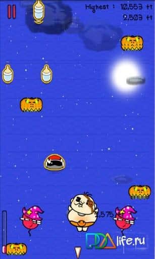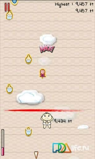 Fly Gaga — еще одна из вариаций платформера для смартфон с Bada OS, в котором игроку предстоит прыгать выше и выше, одновременно собирая бонусы и уворачиваясь от объектов, встреча с которыми заставит начать игру с самого сначала. Вы управляете малышом, который в начале игры забирается на батут и, не без вашей помощи, подпрыгивает. Первый прыжок не очень высок и не опасен, но с каждым прыжком высота будет увеличиваться, и ребенку не обойтись без вашей реакции. На его пути встают ловушки в виде платформ с зубьями, черные сферы и многое другое. Не забывайте собирать бутылочки с детской смесью - они придадут Вашему герою сил и он будет прыгать намного выше.