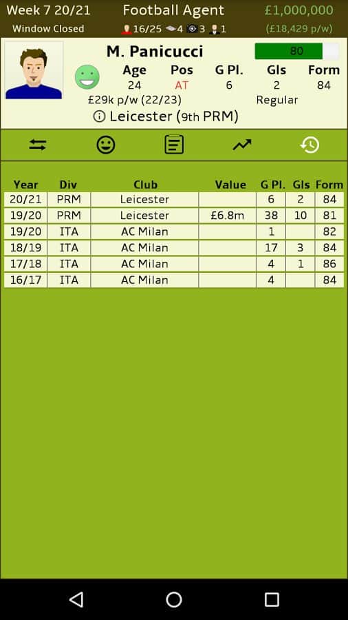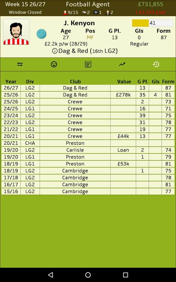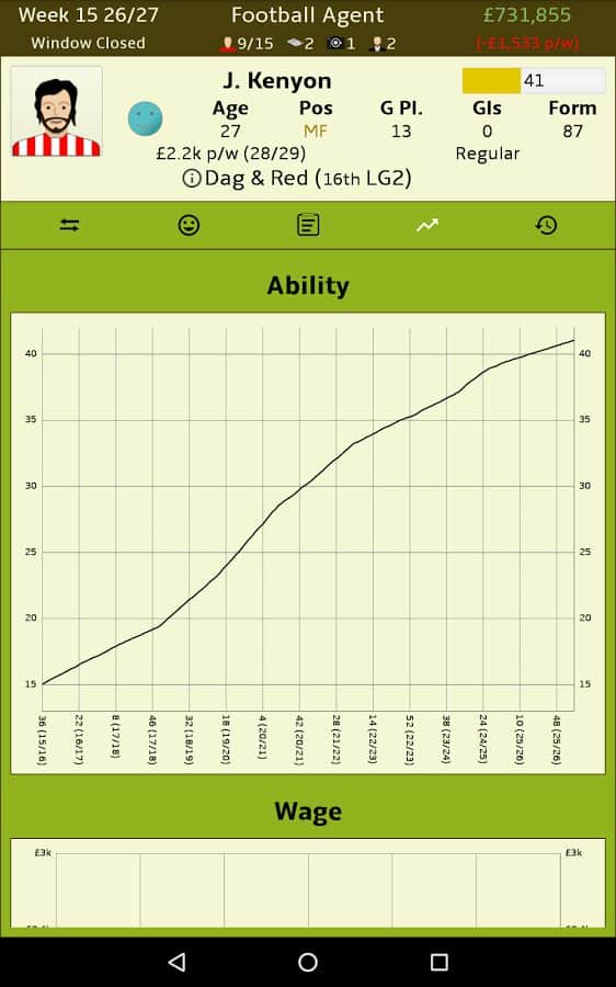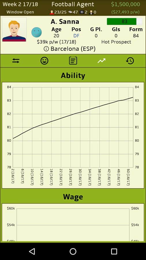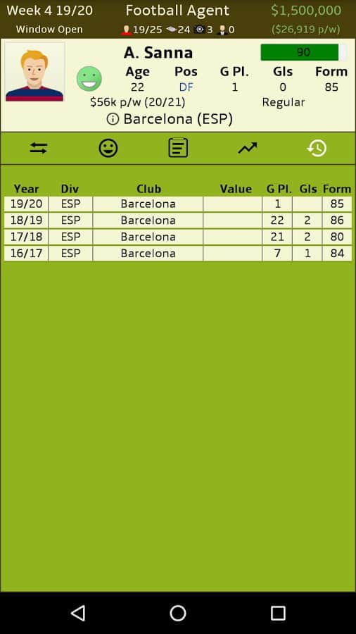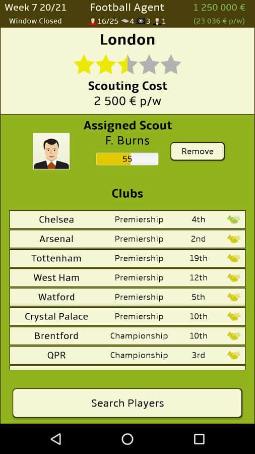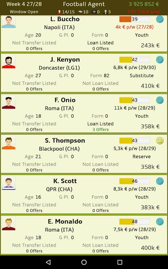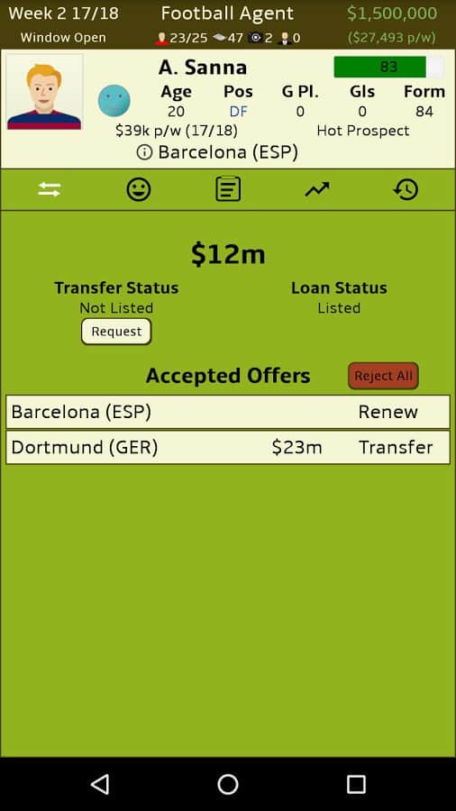 Football Agent – симулятор на андроид, где вы станете профессиональным футбольным агентом. В этой игре вашей главной задачей будет заключать выгодные сделки между различными футбольными клубами, покупать и продавать футбольных игроков. Получайте огромную прибыль и развивайте свой бизнес, занимаясь различными сделками. Выискивайте перспективных игроков для различных клубов, находя будущих звезд и получая за них не малые деньги. В этой игре вас не будет интересовать, выиграет или проиграет футбольная команда, вам будет важно только получение прибыли. Заключайте выгодные контракты с большими футбольными клубами и поднимайтесь на самый верх таблицы лидеров.