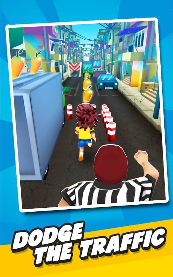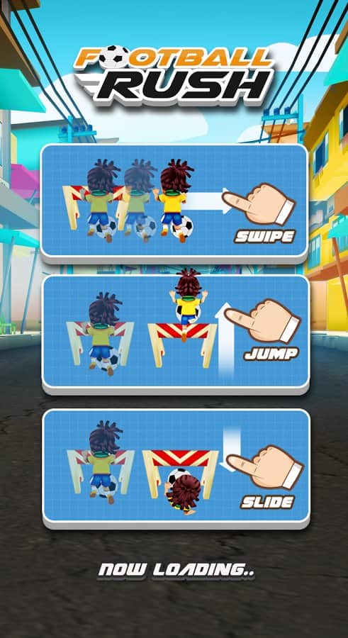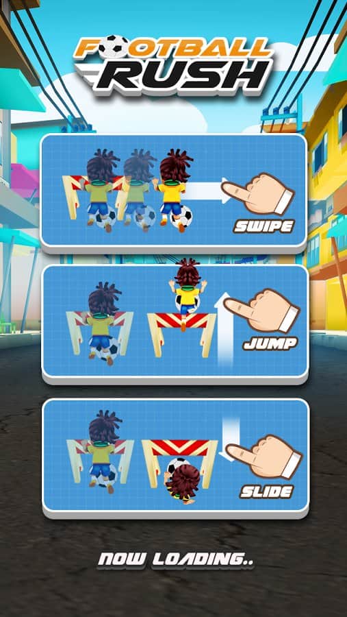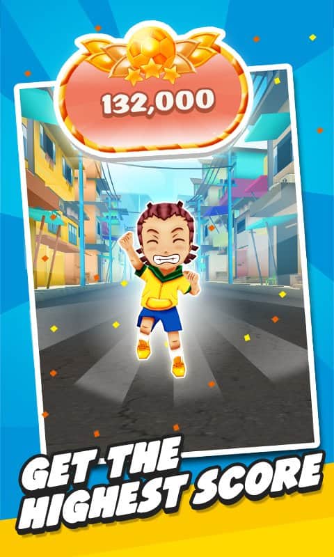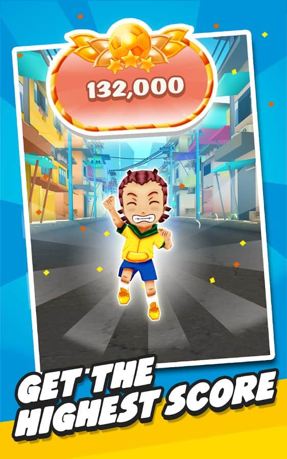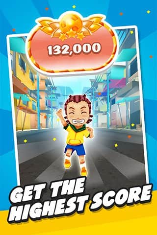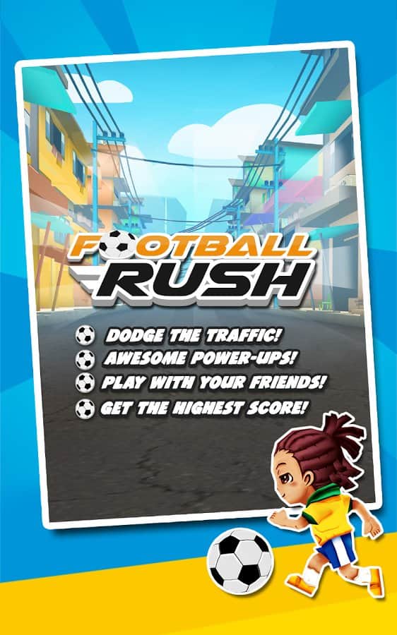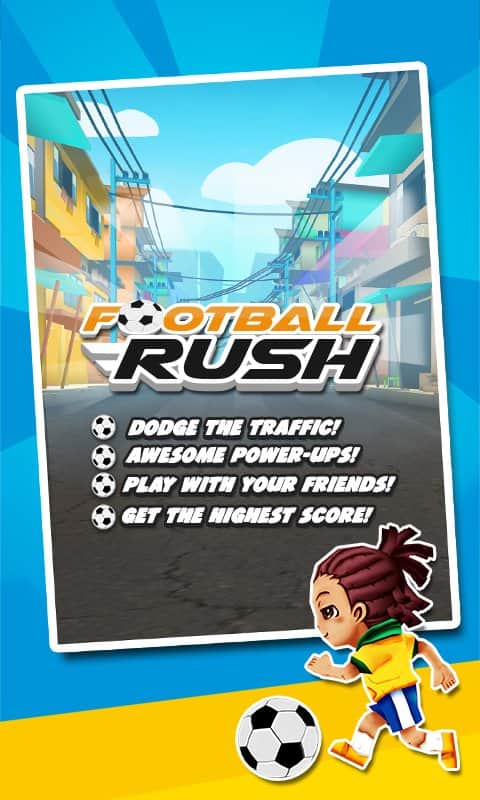 Football Rush 2014: Brazil - веселый раннер на аndroid, в котором вы будет бегать по оживленным улицам Рио-де-Жанейро. Ваш футболист убегает от судьи который хочет назначить ему пенальти и дать красную карточку, не дайте ему догнать вашего героя. Уворачивайтесь от различных препятствий, перепрыгивайте через автобусы и машины, парите на параплане и не забывайте собирать бонусы и монетки. Получайте высокие баллы и поднимайтесь в таблице лидеров на самый верх, конкурируя со своими друзьями за первые места.