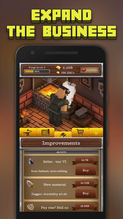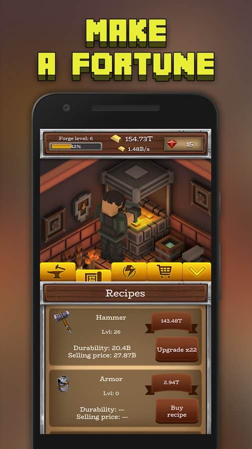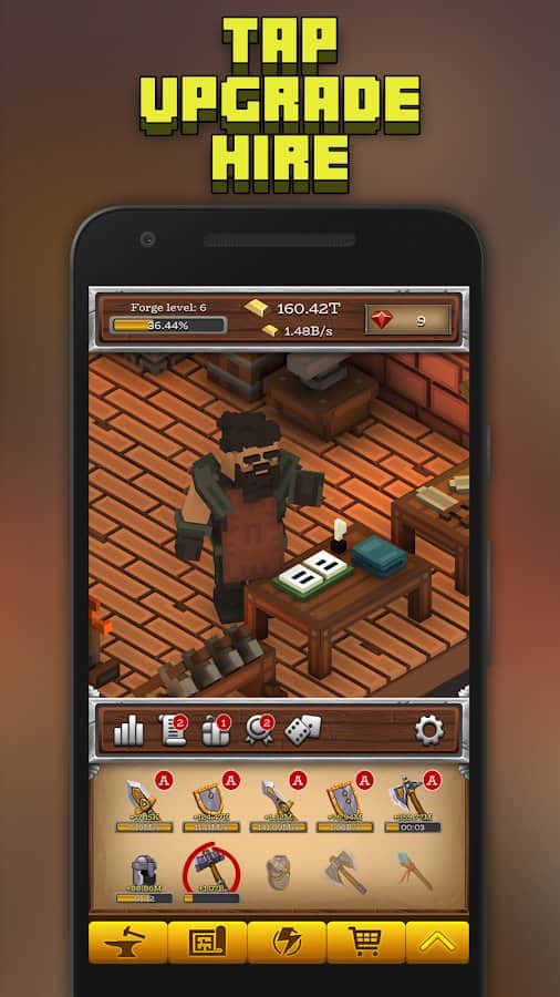ForgeCraft - Idle Tycoon – кликер на андроид, где вы будете помогать кузнецу спасать мир. В этой игре вашей главной задачей будет создавать оружие, доспехи, а также зарабатывать на этом немаленькие деньги и становиться с каждым днем богаче. Станьте величайшим кузнецом и изготавливайте нужные людям вещи и оружие. Кликайте как можно чаще на экран своего телефона или планшета и заставляйте кузнеца выполнять свою тяжелую работу. Расширяйте и развивайте свой бизнес, делая его более прибыльным и успешным. Нанимайте на работу многочисленных помощников, которые будут выполнять многую работу за вас. Зарабатывайте деньги даже в оффлайн режиме и станьте лучшим кузнецом.