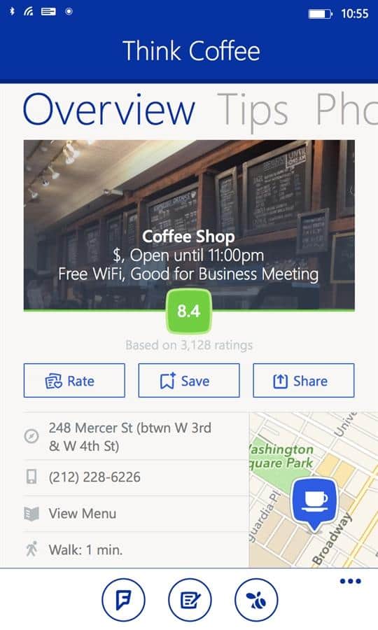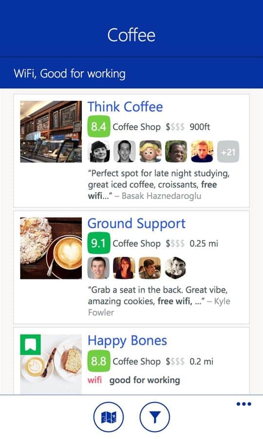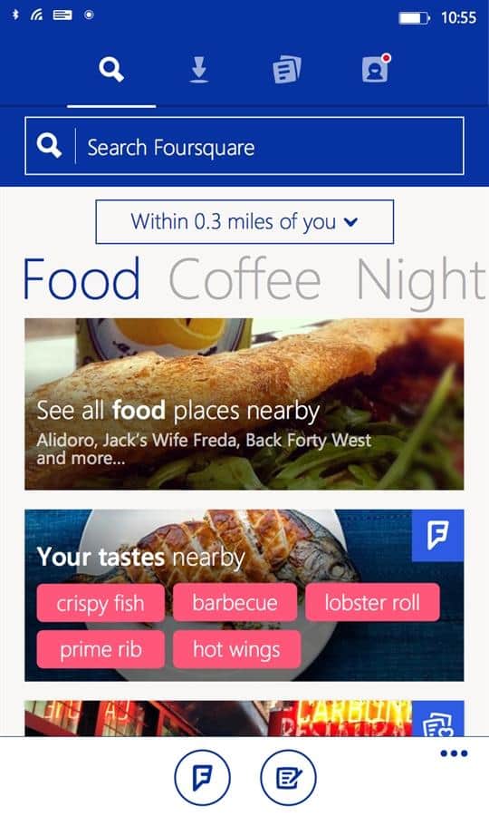 Foursquare - мобильное приложение для windows phone 7, которое помогает вам поддерживать контакт с друзьями, публиковать своё и узнавать их местоположение. Кроме того, здесь присутствует довольно своеобразная система достижений. Очки насчитываются за "чек-ин" в определенных местах (кафе, кинотеатры и прочее). Пользователи могут настроить трансляцию публикаций о их местонахождении в таких сетях как Twitter и Facebook.