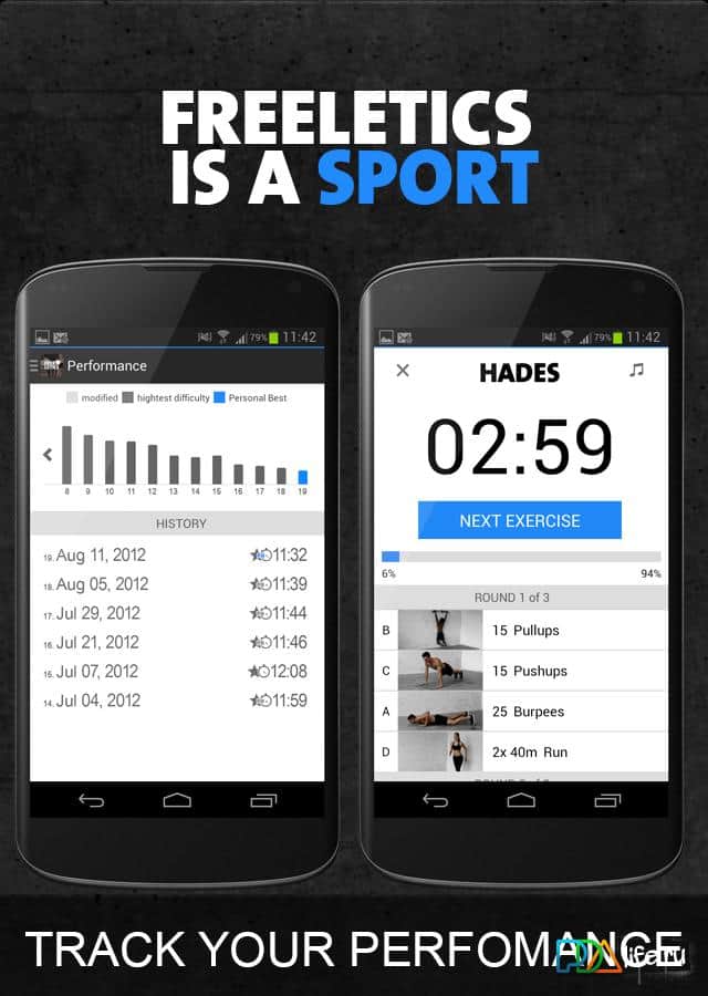 Freeletics – великолепное приложение на андроид для тех, кто любит всегда быть в форме. Freeletics представляет собой комплекс упражнений (тренировок) с видео руководством, что в свою очередь поможет вам максимально правильно и точно выполнять их. Комплекс упражнений занимает время от 5 до 45 минут, уровень сложности упражнений можно выбрать самостоятельно, так что подобные тренировки подойдут не только новичкам, но и профессионалам. Приятно попотеть вам!