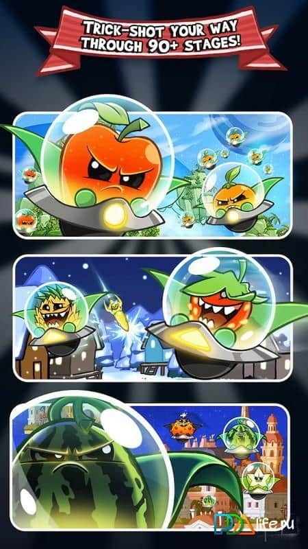 Fruit Attacks – динамичная игра на андроид, в которой вам предстоит защитить Землю от вторжения инопланетян. Злые инопланетяне – фрукты хотят захватить вашу планету и для этого они пойдут на что угодно. Стреляйте по фруктам, не давая им приземлиться на землю, и уничтожайте их прицельным огнем, из различных видов оружия. Выполняйте разнообразные миссии и получайте за это отличные награды и бонусы. По ходу игры открывайте для себя новых помощников, которые помогут в борьбе с инопланетянами и порадуют вас новым оружием и способностями. В игре вас ждут более 180 уровней и забавные персонажи, которые не дадут вас скучать на протяжении долгого времени.