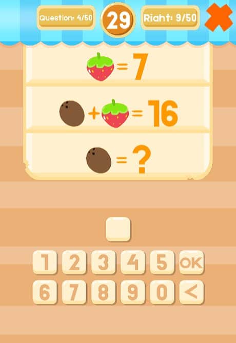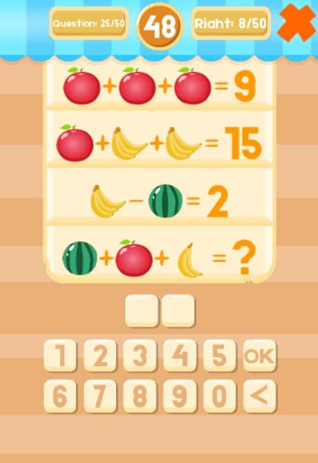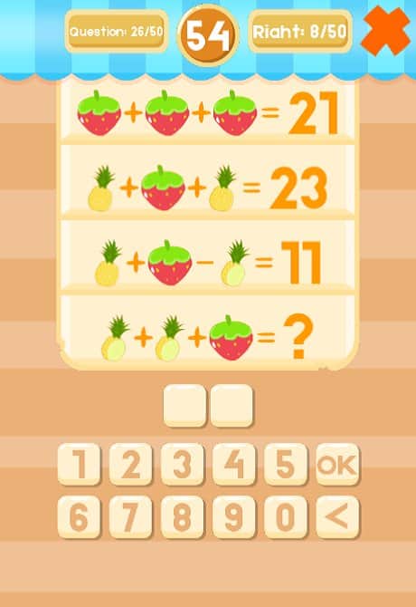Fruit Math - интересная и занимательная головоломка на андроид, где вы будете решать непростые задачки. В этой игре перед вами покажутся различные примеры из фруктов, вашей задачей будет решить их в уме и правильно написать ответ. Эта игра подойдет как для взрослых так и для детей, где они смогут быстро научиться считать в уме и решать примеры. Игра порадует вас отличной яркой графикой, многочисленными примерами и задачами, а также захватывающим игровым процессом, где вам придется не раз поломать голову, чтобы пройти тот или иной уровень. С каждым новым уровнем сложность игры будет увеличиваться.