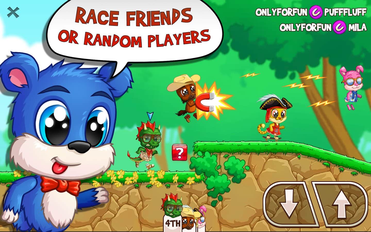 Fun Run Arena Multiplayer Race – третья часть сумасшедших гонок на андроид, с многочисленными и разнообразными уровнями. В этой игре вы будете бегать по уровням в компании восьмерых соперников и стараться первым прейти к финишу и заполучить все награды добиваясь успеха. Бегите вперед обгоняя своих соперников при этом избегая многочисленных преград и ловушек. По пути своего следования собирайте различные бонусы и применяйте их в действии, тем самым проделывая невероятные прыжки и трюки, карабкайтесь по стенам и уклоняйте от атак преследующих вас соперников. Поднимитесь на самый верх таблицы лидеров и установите свой рекорд в этой игре.