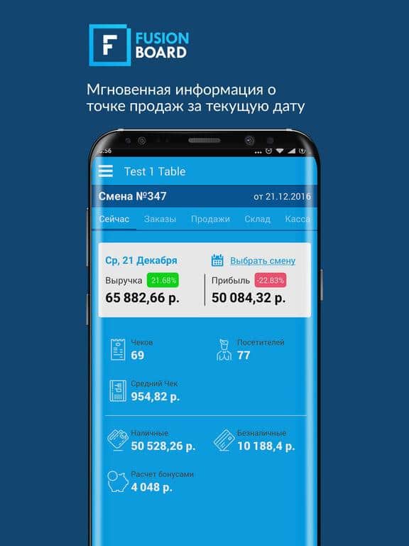 Fusion Board предназначается для бизнесменов, владеющих кофейнями, барами, ресторанами, кафе или магазинами. Если вы относитесь к их числу, а также используете систему автоматизации Fusion POS , то обязательно установите данное приложение. Оно позволит вам следить за состоянием дел в вашем заведении из любой точки земного шара. Вы сможете узнавать последние новости о количестве посетителей в своем заведении, остатках товара на складе, о заказах, о том, сколько денег было выручено за день и другую необходимую информацию.