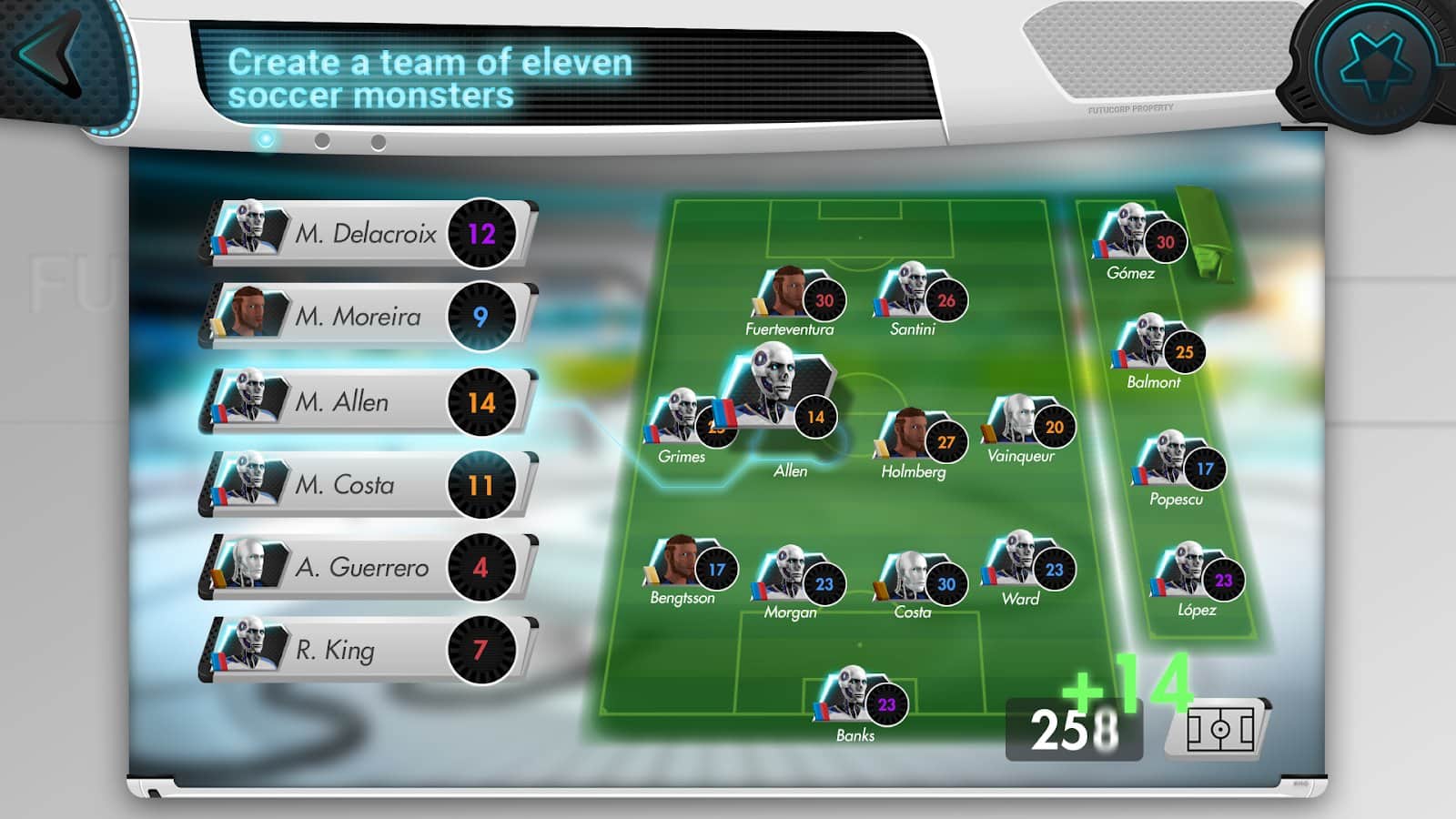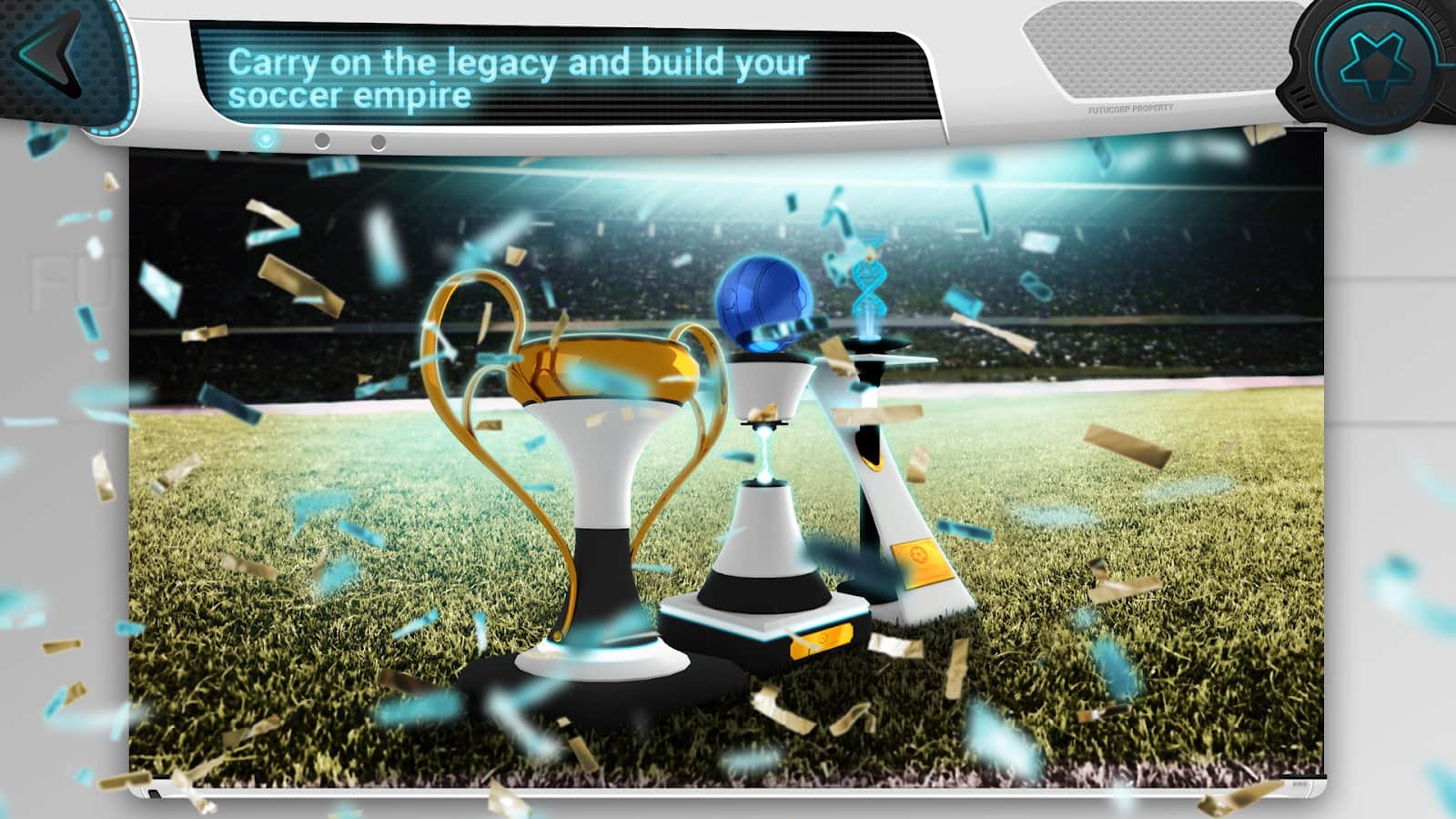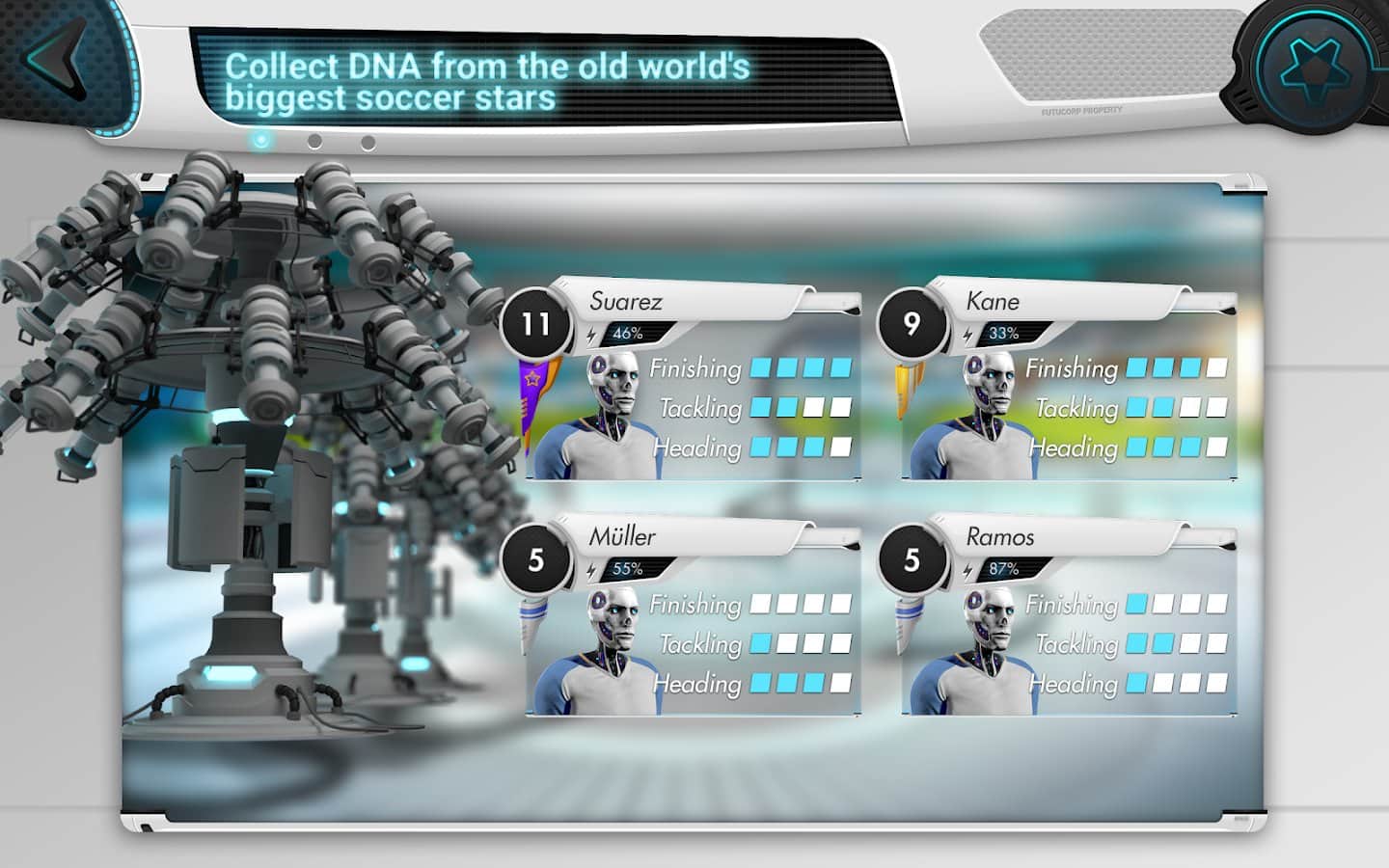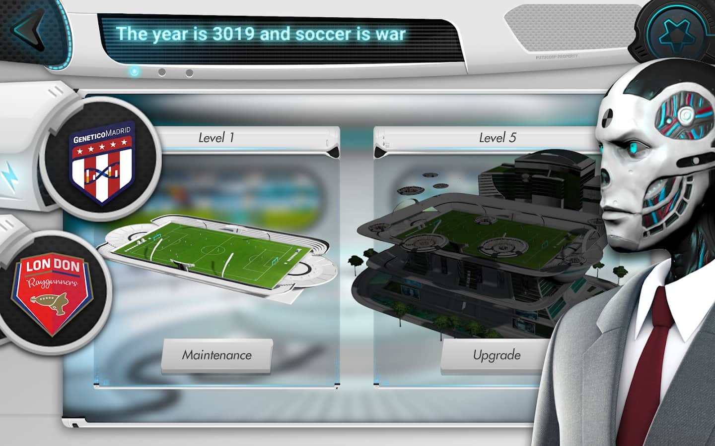 Futuball — футуристический футбольный менеджер – спортивная игра на андроид, где вы будете играть в футбол будущего. В этой игре вы перенесетесь в далекое будущее в 3020 год где в футбол играют роботы и превратился он в настоящую войну. Футбольные клубы получили образцы ДНК футбольных легионов старого мира и теперь могут создать непобедимые команды. Создайте команду из одиннадцати самых продуктивных и опытных роботов. Выступайте в роли футбольного менеджера команды роботов и приведите ее к победе. Бросайте вызов игрокам со всего мира и примите участие в многопользовательских PvP-сражениях с друзьями и другими менеджерами. Играйте в игру и наслаждайтесь отличной 3D графикой, мини-играми и захватывающими матчами.