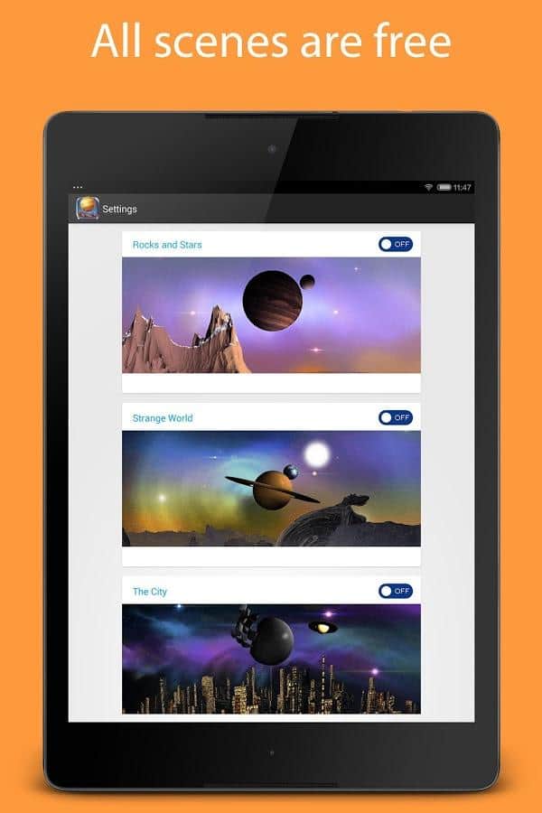 Galaxy Legends Live Wallpaper – фантастические живые обои на андроид телефоны и планшеты любого разрешения. Благодаря этим живым обоям вы погрузитесь в невероятную останову космического пространства и откроете для себя, целую галактику. Выбирайте для себя понравившийся ландшафт и наслаждайтесь красивыми эффектами мерцания звезд и планет. Путешествуйте по всей галактике и наблюдайте за движением комет, астероидов, звезд, космических кораблей и планет. Установите эти живые обои прямо сейчас и они порадуют вас широким выбором настроек и минимальной затратой батареи и отличной графикой.