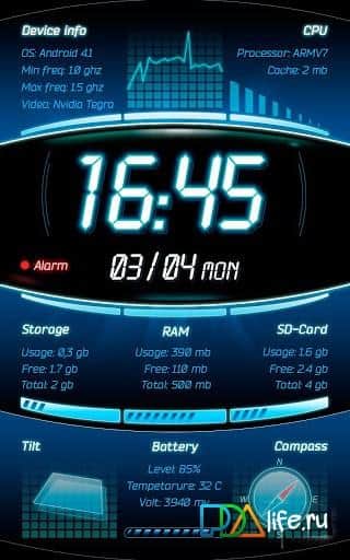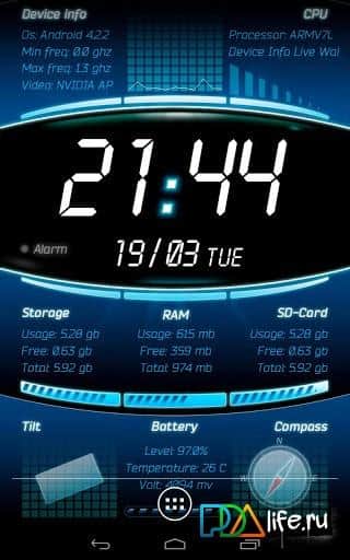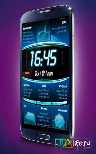 Galaxy S4 Device Info LWP – живые обои для андроид устройств с отображением информации о происходящем в вашем смартфоне: заряд и температура батареи, CPU Usage, RAM статистика, внутренние/внешнее использования памяти, CPU спецификации, отображение времени и даты, компас, а так же многое другое.