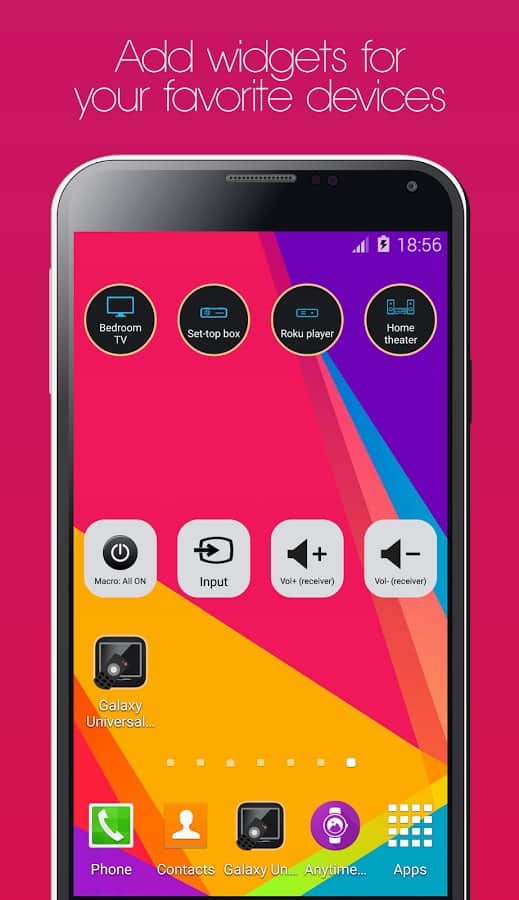 Galaxy Universal Remote - Это уникальный пульт практически от всего в вашем доме. Пульт для телевизора больше не нужен, это приложении поможет даже в этом. Все что нужно для его работы это ИК порт в вашем смартфоне. На данный момент не все модели смартфонов поддерживают это приложение, однако разработчики обещают что поправят эту проблему. А вы в свою очередь сможете наслаждаться тем что управляете всем с помощью одного пульта.