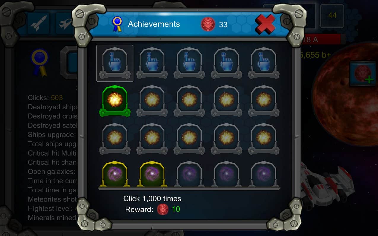 Galaxy War Clicker – кликер игра на андроид, где вам предстоит вести бесконечную битву в галактике, с кораблями противника. Ваш корабль оснащен самым мощным оружием и чтобы победить врагов, вам предстоит кликать по экрану своего телефона или планшета, чтобы наносить удары. Отправляйтесь в увлекательное путешествие в межгалактическое пространство и сразитесь там с огромными эскадрильями врагов. Ваши враги не дремлют, так что постоянно увеличивайте мощность своего корабля и не забывайте про дронов, которые помогут вам в борьбе с врагами. По ходу игры улучшайте свой корабль и благодаря новым технологиям и умениям добивайтесь лучших результатов в игре.