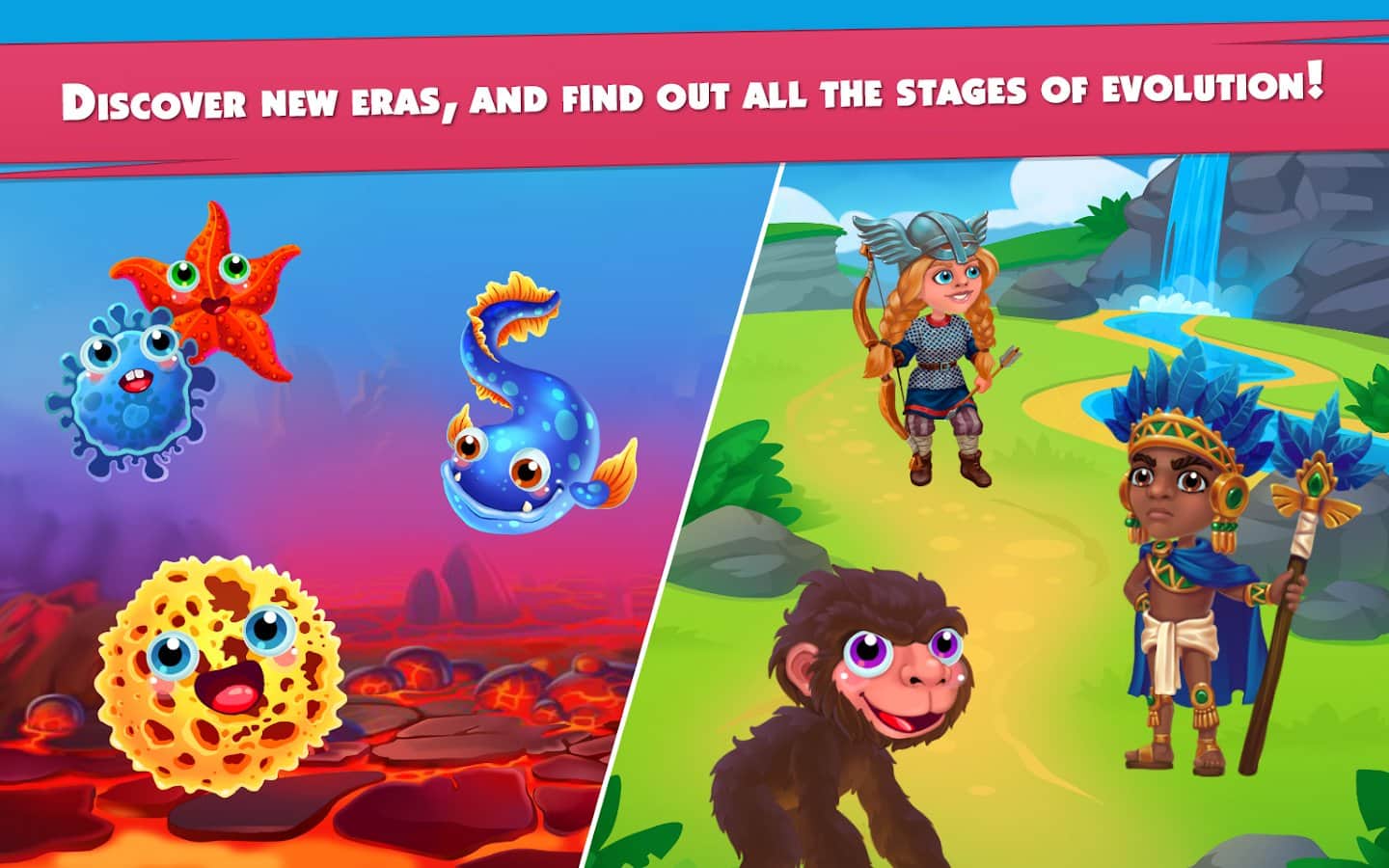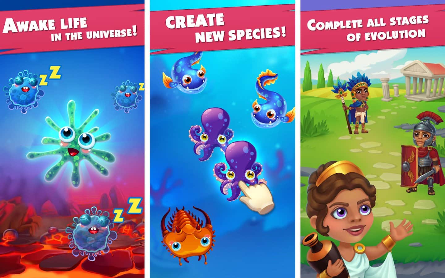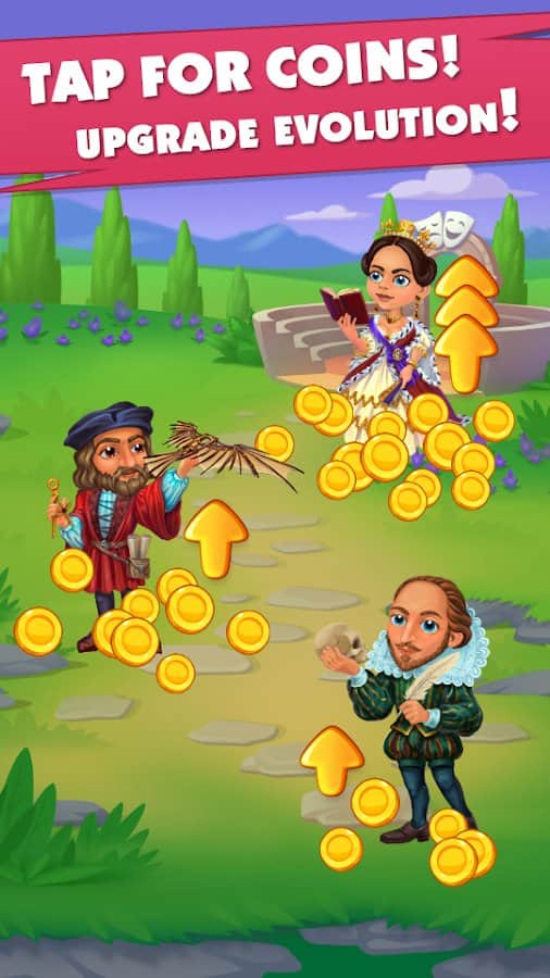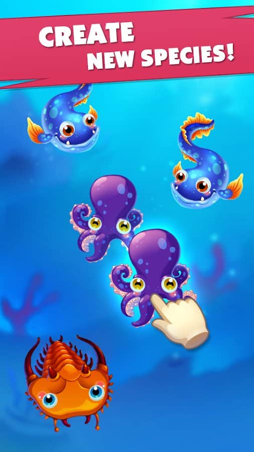 Game of evolution: Idle click and merge – увлекательная игра на андроид, где вы будете наблюдать за эволюцией различных видов. В этой игре вашей задачей будет объединять одинаковые микроорганизмы и получать более сложные существа, которые заселят Землю. Наблюдайте за эволюцией видов и при этом зарабатывайте монетки получайте улучшения. Касайтесь экрана своего телефона или планшета и смотрите как бактерии и другие микроорганизмы превращаются в рыб, животных и даже людей. Наблюдайте за эволюцией различных видов и поднимайтесь все выше по древу эволюции. Проведите всех обитателей земли через эволюционный период.