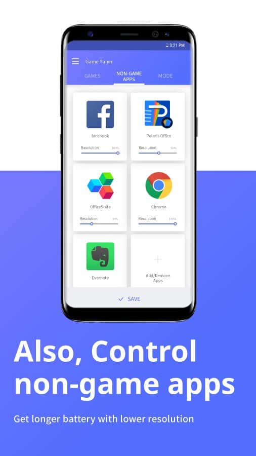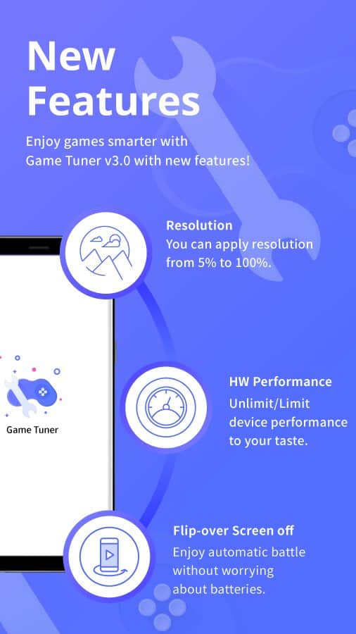 С помощью Game Tuner вы сможете изменять разрешение и частоту кадров во многих мобильных играх прямо у себя на смартфоне! Так же вы сможете контролировать расход вашего аккумулятора, что очень важно в играх, особенно когда играете в дороге и подзарядить ваш гаджет нет возможности.