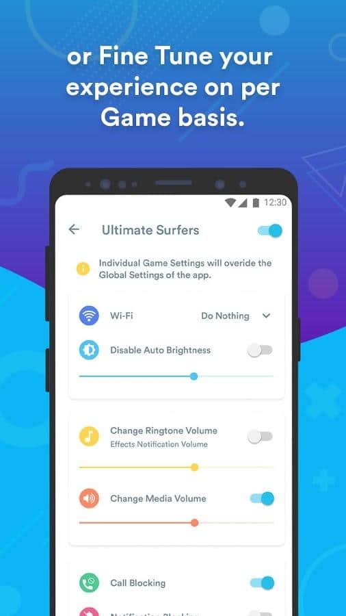 Gaming Mode - The Ultimate Game Experience Booster позволяет во много раз улучшить состояние игрового процесса в PlayStore, ускорить его и оптимизировать работу важных функций и настроек. При этом не нужно каждый раз при запуске игры заново запускать приложение, все будет в автоматическом режиме после первичного использования. Возможно настроить параметры касательно каждой игры в отдельности, если вам так будет удобнее. Устанавливайте автоотклонение входящих вызовов, блокируйте уведомления, очищайте фоновые приложения, регулируйте яркость экрана, меняйте значения Wi-Fi, громкость медиа, создавайте виджеты для каждой игры и не только.