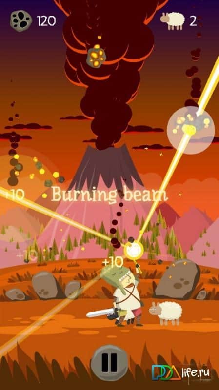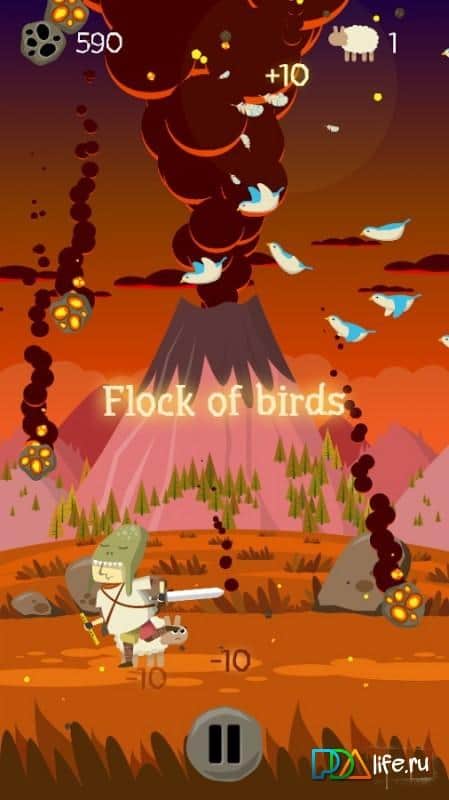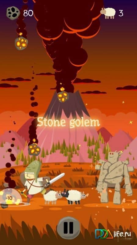 Подвиг Гамли – игра на андроид, в которой вы будете помогать пастуху Гамли, спасать свое стадо овец от гибели. Был обычный день, нечего не предвещало беды, наш пастух пас своих овец на лугу и наигрывал приятную мелодию на свирели. Как вдруг проснулся тысячелетний вулкан Мальгора и стал извергать столбы пыли и пепла. Наш герой понял, что деваться не куда и достал свой меч, стал отбивать летящие глыбы и камни, защищая своих овец. Помогите герою в его нелегком труде. Это бесконечная игра с яркой графикой и невероятными бонусами, которые будут выручать вас в сложных ситуациях. Управляйте своим героем с помощью одного пальца и получайте достижения.