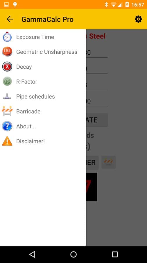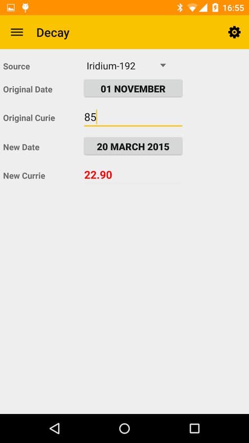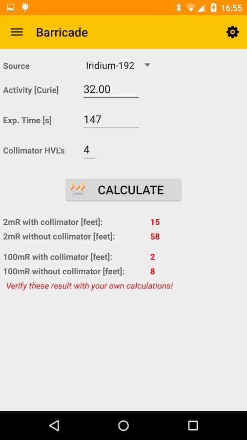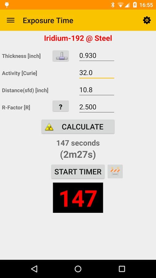 Gamma Ray Calculator Pro - с таким приложением техникам можно с точностью рассчитывать время, расстояние, экспозицию для приборов с рентгенографией. Программа позволяет производить полный контроль над источниками с иридием-192, кобальтом-60 и selinium-75. В вычислении громоздких формул и использования калькуляторов старого типа больше нет никакой необходимости. Достаточно лишь запомнить некоторые данные: толщину, исходное расстояние и активность, и программа сразу же выдаст точно время экспозиции. Наличие R-фактора позволит измерить любой тип плёнки и плотности.