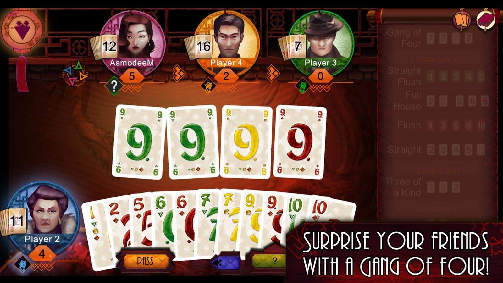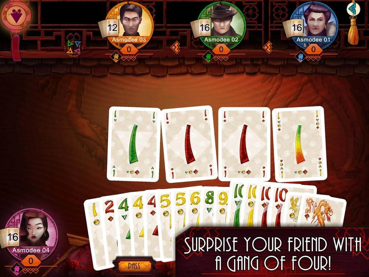 Gang of Four: The Card Game - Bluff and Tactics – карточная игра на андроид, где вы окунётесь в мир мафии. В этой игре вы примите участие в битвах и борьбе за влияние "Банды четырех". Разрабатывайте свою непобедимую стратегию ведения игры и постарайтесь избавится от своих карт быстрее чем это сделают ваши соперники. Комбинируйте между собой карты в классические комбинации пары, фулл-хаус, стрит-флеш и другие и получайте преимущество над противниками.