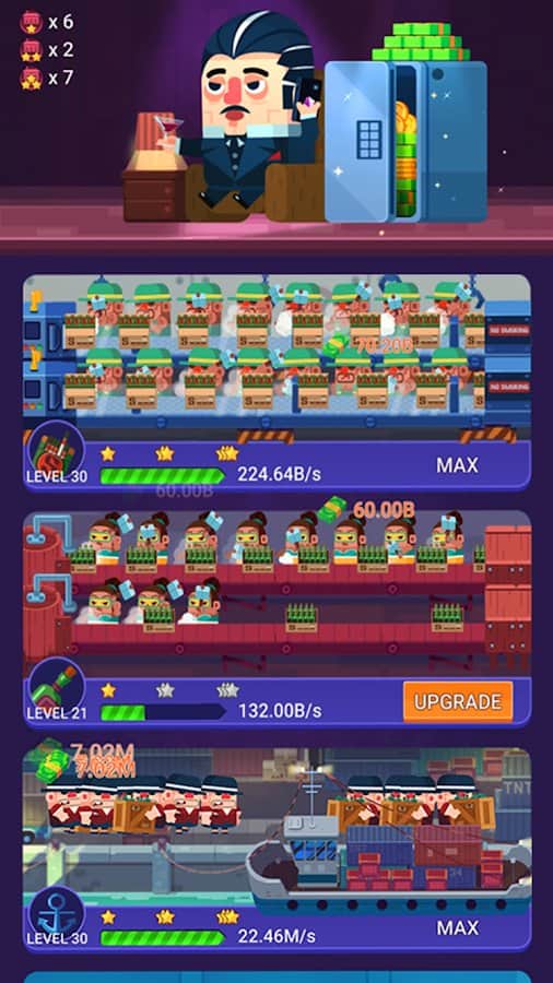 Ganster Tycoon – увлекательная игра на андроид, где вы будете выступать в роли мафиозного босса. Вам необходимо касаться экрана своего телефона и таким образом получать деньги. Управляйте нелегальным бизнесом и торопите своих рабочих и собирайте как можно больше прибыли. Расширяйте свои территории и открывайте новые виды бизнеса чтобы получить сверх прибыли. Получайте больше денег с каждым касание к телефону и покупайте себе любую недвижимость, дорогие машины и яхты. Играйте в этот кликер и наслаждайтесь забавными персонажами, многочисленными улучшениями и простым управлением.