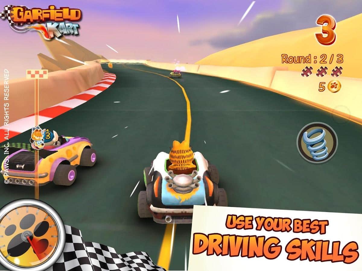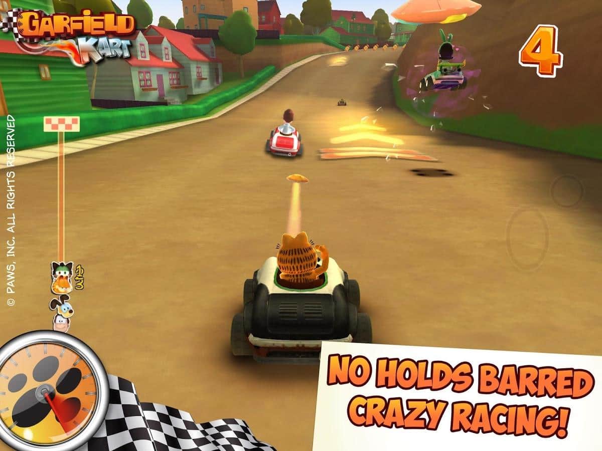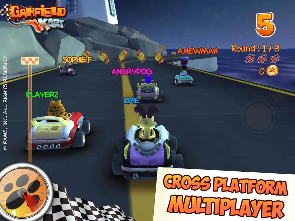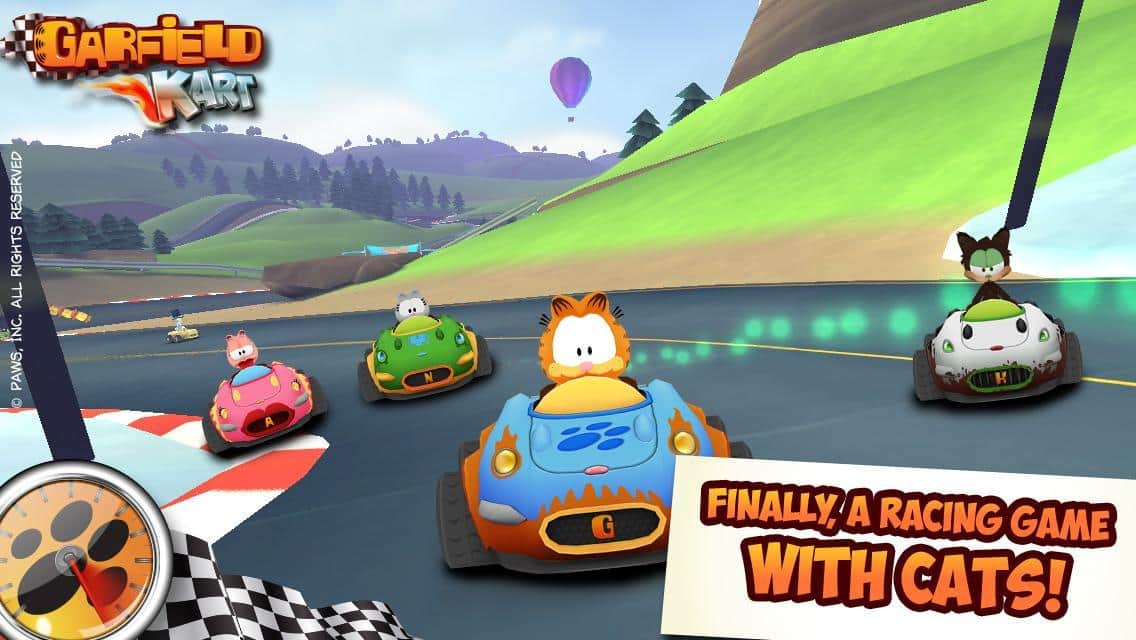 Garfield Kart - игра на аndroid, в которой вы будете гонять вместе с Гарфилдом и его друзьями Оди, Джоном и Нермолом по различным трассам. Выбирайте себе подходящего героя и соревнуйтесь с друзьями в этой многопользовательской игре.
