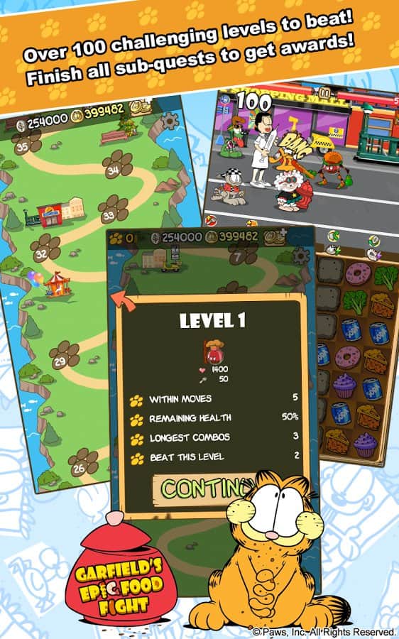 Гарфильд - наверно самый знаменитый кот во всем мире, ну в США то точно. А получил он свою популярность благодаря довольно распространённой черте характера, банальной лени, но при этом нашему герою удалось возвести лень в совершенно новую степень, за что он и получил звание самого ленивого кота. Гарфильд стал главным героем мультипликационного сериала, полнометражного фильма и целого ряда комиксов, ну конечно создатели игр тоже не остались в стороне. Garfield's Epic Food Fight - красочная игра из серее три в ряд, по своему геймплею напоминающая нетленный хит Match 3 Quest. Действие Garfield's Epic Food Fight начинают разворачиваться после того как вся еда в городе оказывается в огромной опасности, в подобной ситуации даже самый ленивый кот способен на подвиг. А ваша задача помочь Гарфильду одолеть инопланетных захватчиков и спасти пропитание.