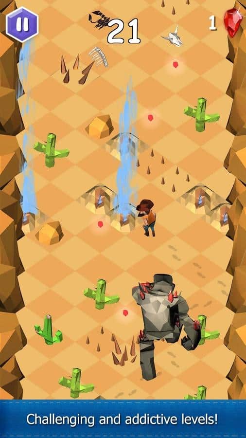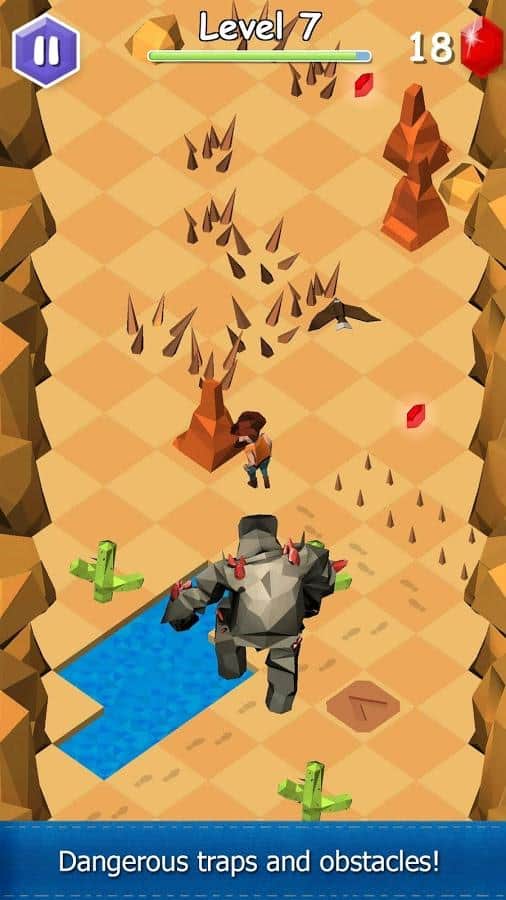 Gem Raider – раннер на андроид, в котором вы будете помогать отчаянному бегуну уйти от преследования огромного голема. Ведите своего героя вперед через опасную пустыню, наполненную многочисленными ловушками и преградами. Покажите на деле свою отличную реакцию, управляя героем и помогая ему убежать от монстра. По пути своего следования собирайте рубины и драгоценные камни, которые помогут вам открыть новых забавных героев. Пройдите все 20 уровней этой игры и установите свой рекорд по времени и количеству очков, соревнуясь со своими друзьями. Наслаждайтесь игрой и проверьте на деле два режима этой игры.