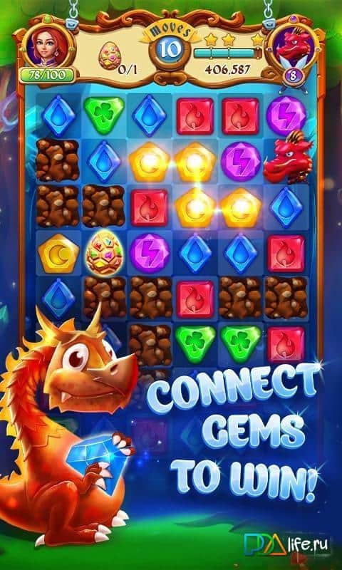 Gems and Dragons: Match 3 – соединяйте воедино одинаковые по цвету драгоценные камни и убирайте их с поля. Эта игра из жанра три в ряд, где вам предстоит угодить дракону, собрав для него разноцветные драгоценные камни. Составляйте как можно длиннее ряды из камней и взывайте их, получая отличные бонусы. В этой игре вы сможете соединять камни как по вертикали так и диагонали делая как можно длиннее цепочку. Приготовьтесь к захватывающему путешествие в страну драконов, где вам предстоит познакомиться с милыми созданиями. Применяйте отличные бонусы и устанавливайте новые рекорды в прохождении этой игры.