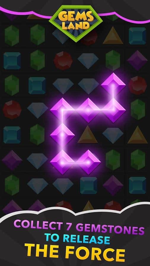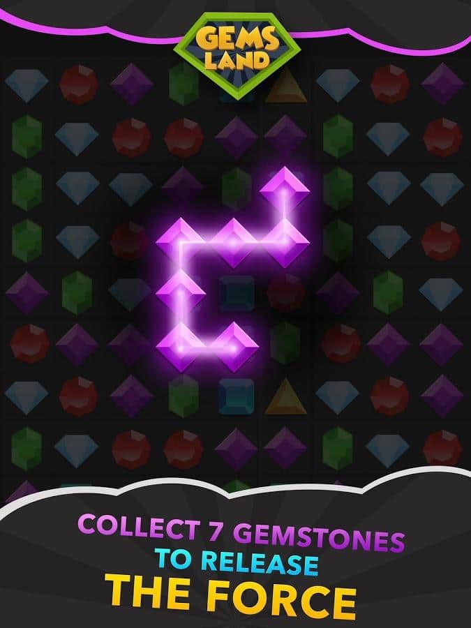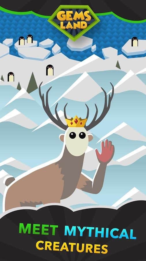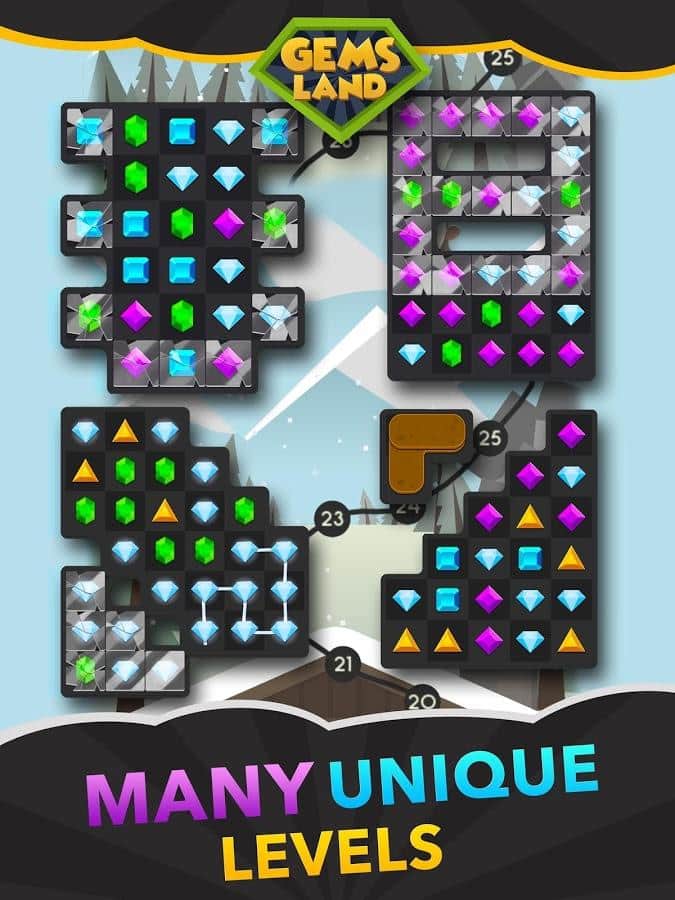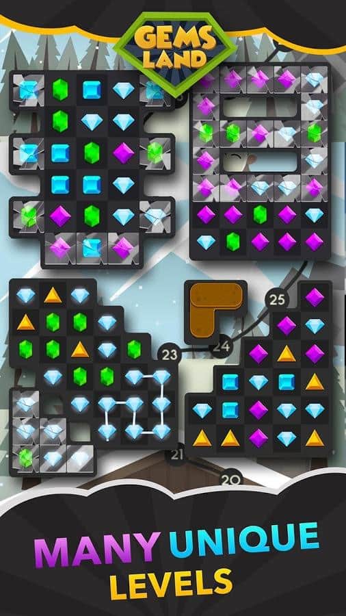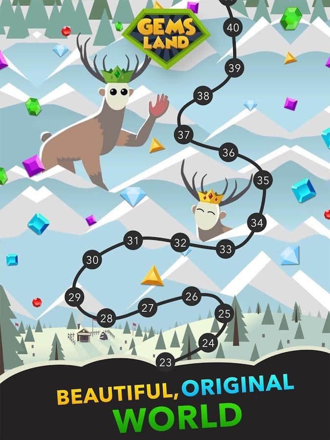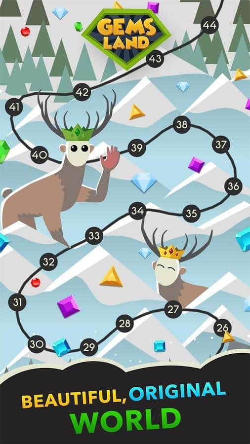 Gems Land-new free match 3 game, connect the dots! – увлекательная игра из жанра три в ряд на андроид, где вы будете путешествовать по сказочной стране в сопровождении Лесного духа. Вашей задачей будет составлять максимальные цепочки из кристаллов и взрывать их. Чем больше вы уничтожите кристаллов, тем больше очков заработаете и сможете соревноваться с лучшими игроками. Применяйте многочисленные бустеры и бонусы, которые помогут вам пройти самые сложные уровни. Применяйте многочисленные усиления и получайте по три звезды в каждом уровне. Пройдите все 50 уровней этой игры и путешествуйте по заснеженным лесам и ледяным водам.