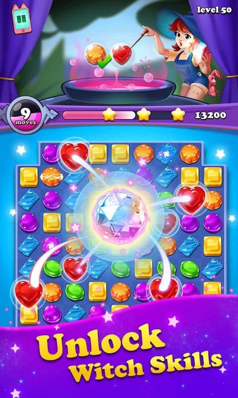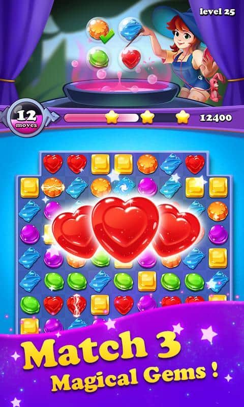 Gems Witch – игра из жанра три в ряд на андроид, где вы будете помогать ведьме Селине научиться варить волшебные зелья. Нашей героине пришло письмо из магической школы о том, что она принята в нее и может повысить свои умения. Но сова Асио отбирает ее предложение и с этого и начинается увлекательная история. Составляйте ряды из трех и более объектов и создавайте различные зелья и снадобья улучшая и прокачивая свои навыки. Исследуйте волшебный лес и школу волшебства и играйте в любое свободное время.