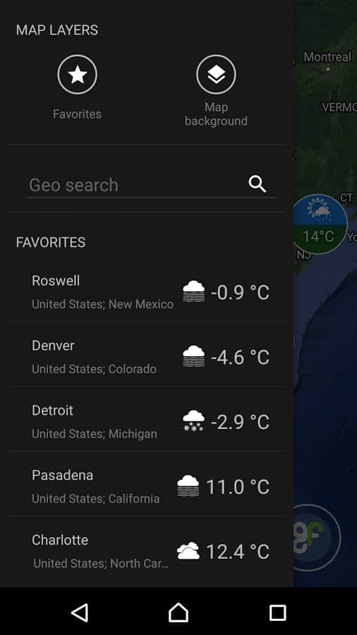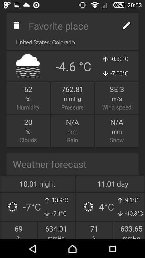 Geo Forecast - Прогноз погоды по всему миру. Теперь вы сможете узнать самый точный прогноз, в любой точке планеты, хотите знать погоду на бора-бора? Да запросто! Всего пару тапок по экрану и вот вы уже знаете какая там была погода, и какая будет. Здесь предусмотрен не только показ температуры, но так же и скорость, направление ветра, вероятность осадков и множество других данных о погоде в отдельном регионе. Всё это собрано и укомплектовано в одно приложение с удобным и простым интерфейсом и множеством различных функций.