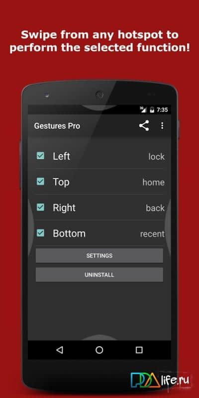 Gestures (Swipe) Pro - Простое и удобное управление всем вашим смартфоном с помощью жестов. Вы сможете сами создавать условия для своих действий, и тогда управление станет намного проще. В задания которые вы можете привязать к жестам входят основные команды, такие как :Lock, back, home, search, recents, power quick, toggle. Так же здесь присутствует детальная настройка, так что вы сможете поставить все с точностью до мелочей, и никогда не будете совершать лишних или ошибочных жестов.