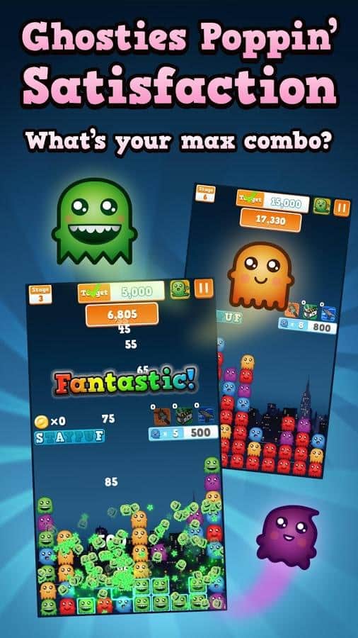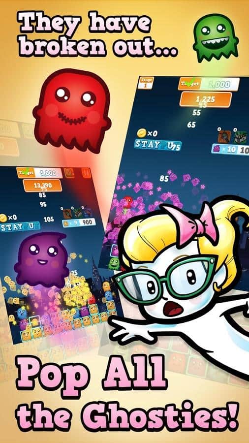 Ghost Poppers - Игра из серии 3 в ряд, в которой вам предстоит воевать с приведениями! Ловите ужасных приведений, с помощью всего одного касания. Вы сможете передвигать их, менять местами, и уничтожать по несколько штук сразу. Задания не всегда будет одинаковым, и иногда вам предстоит не просто уничтожать а выполнять эти миссии. Отправляйтесь в приключение, и победите приведений.
