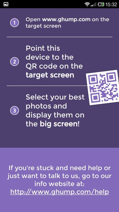 Вы заходите с компьютера на сайт сервиса http://www.ghump.com, запускаете приложение на смартфоне и считываете QR-код, который свяжет ваши устройства. Далее вы сможете выбрать интересующие фотографии или показать все. Управление показом галереи осуществляется со смартфона, так же можно перейти к полноэкранному режиму и масштабировать изображения.